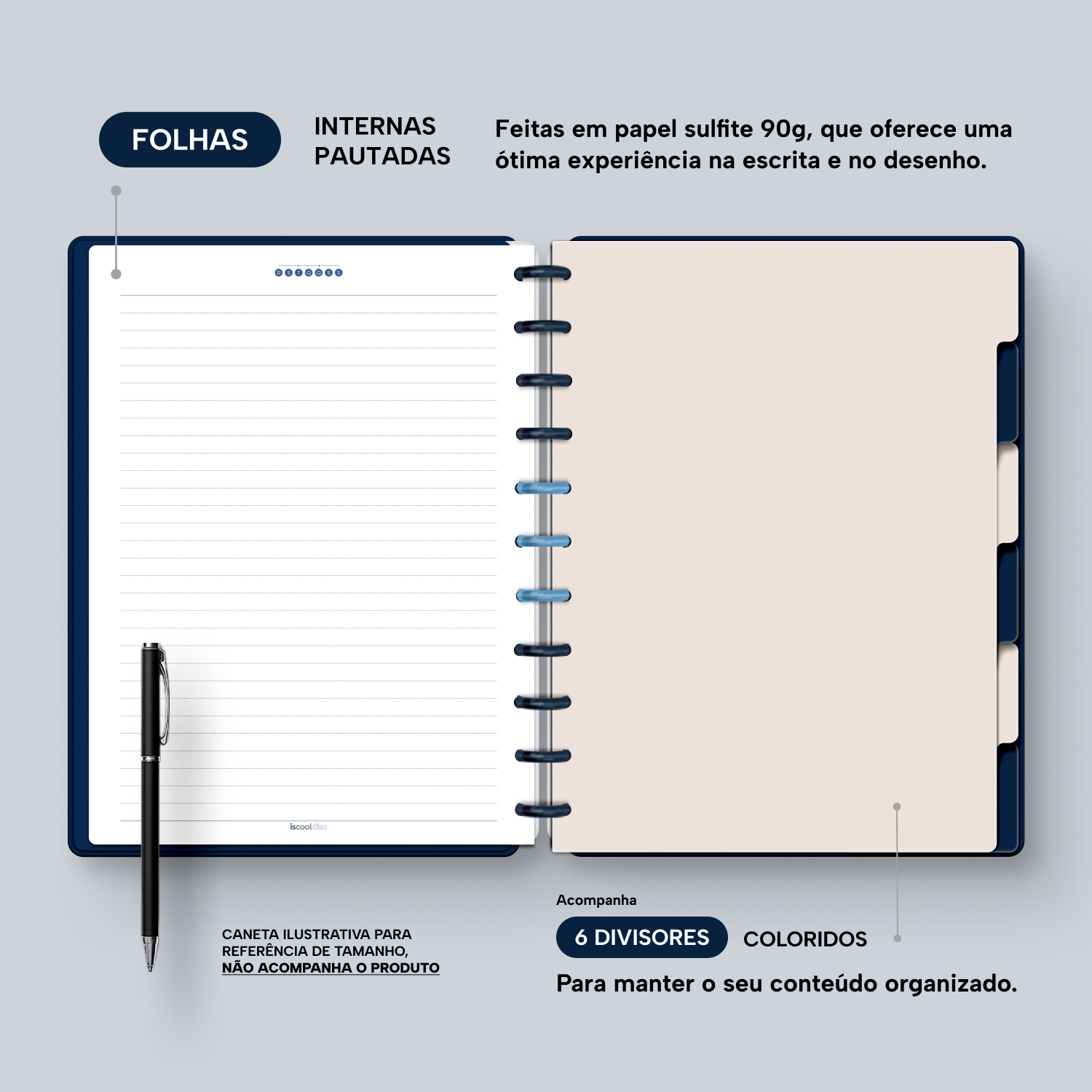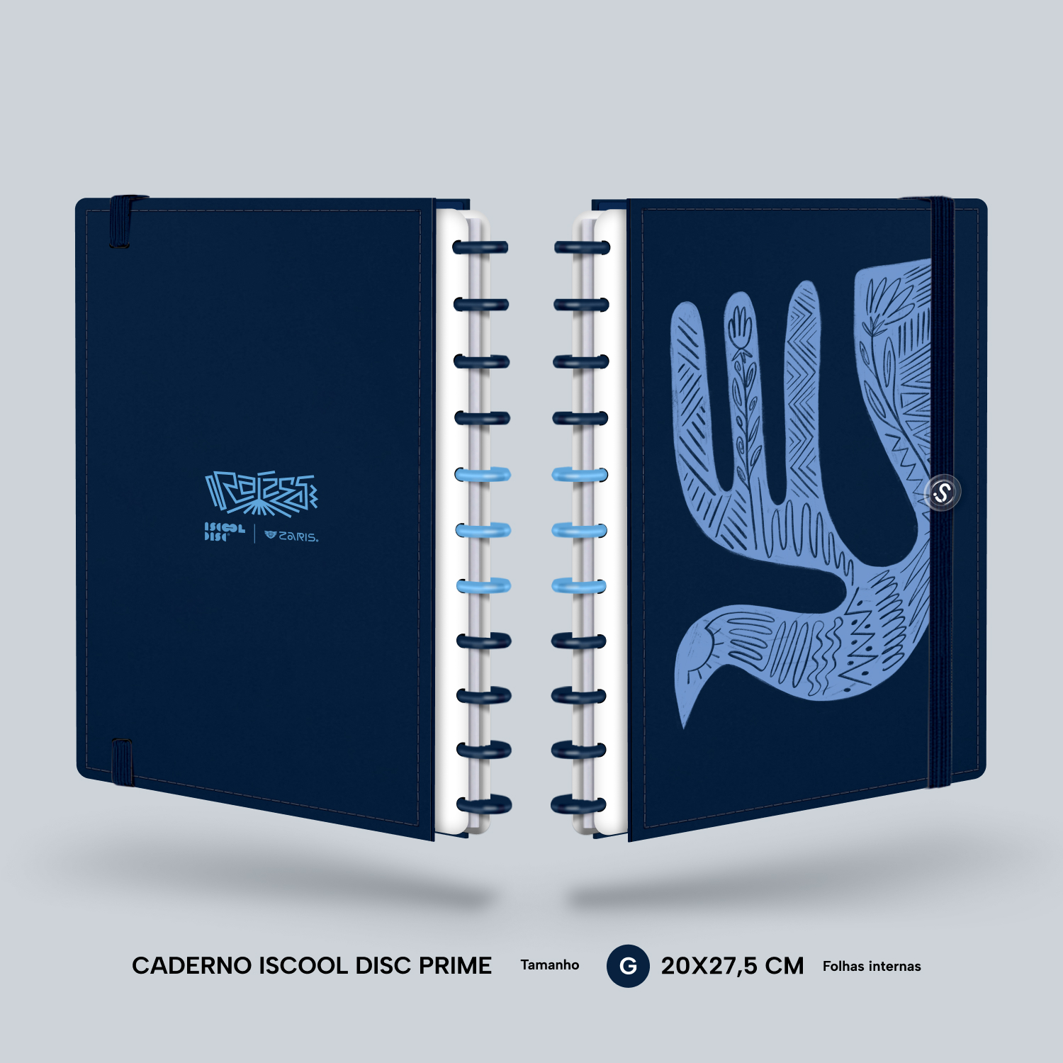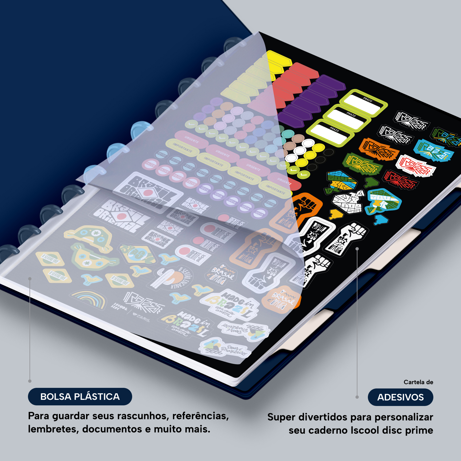 Além de tudo isso, o iscooldisc Prime conta com detalhes que fazem toda a diferença: elástico para fechamento da capa, muito mais estilo e privacidade para suas anotações; bolsa plástica para guardar seus rascunhos, referências, lembretes, documentos e uma cartela de adesivos incríveis, para que você possa personalizar seu caderno do seu jeitinho!