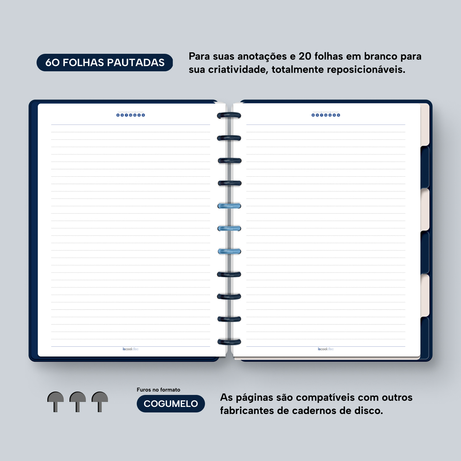 Com furos no formato de “cogumelo”, você poderá dar um “up” em seu caderno com nossos refis, além de ser compatível com outros fabricantes de cadernos de discos.