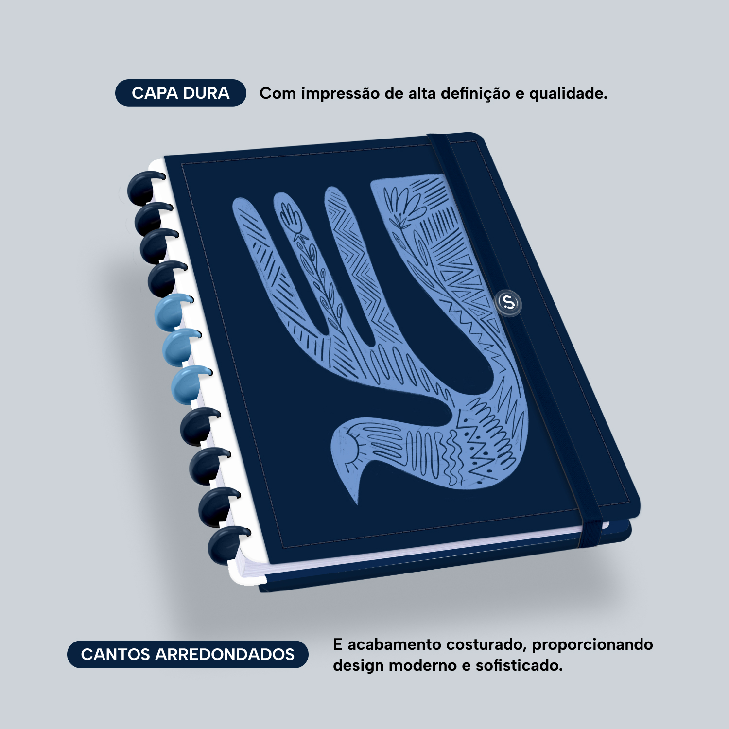 A capa é dura, com impressão digital de alta definição, e acompanha 6 lindas divisórias que você pode colocar em qualquer local do caderno, funcionando como o guia perfeito para sua organização.