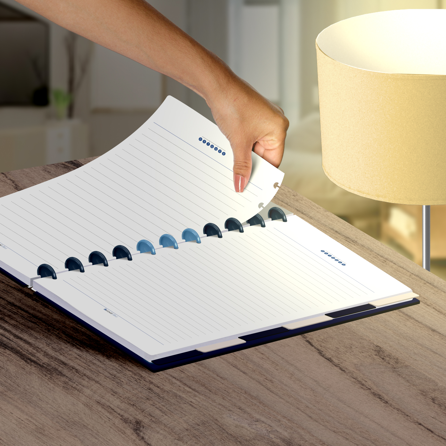 Encadernado com 11 discos M de 23mm em polímero de nylon e/ou policarbonato coloridos, fabricados no Brasil.