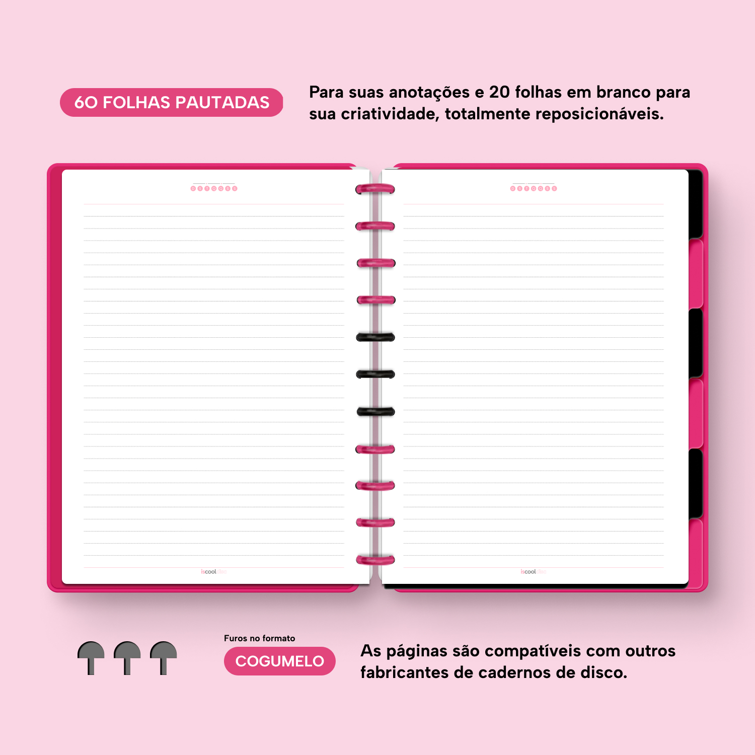 Com furos no formato de “cogumelo”, você poderá dar um “up” em seu caderno com nossos refis, além de ser compatível com outros fabricantes de cadernos de discos.