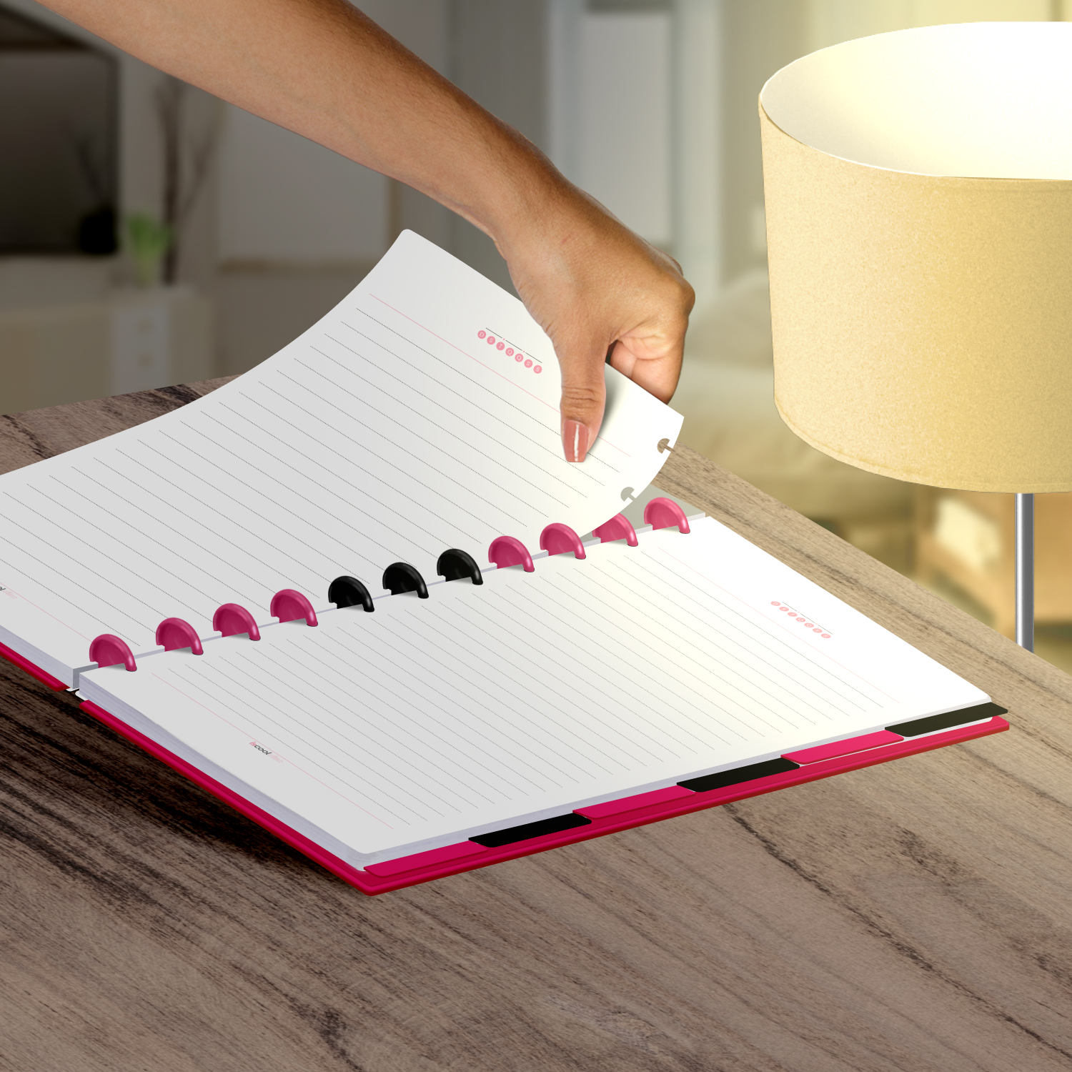 Encadernado com 11 discos M de 23mm em polímero de nylon e/ou policarbonato coloridos, fabricados no Brasil.
