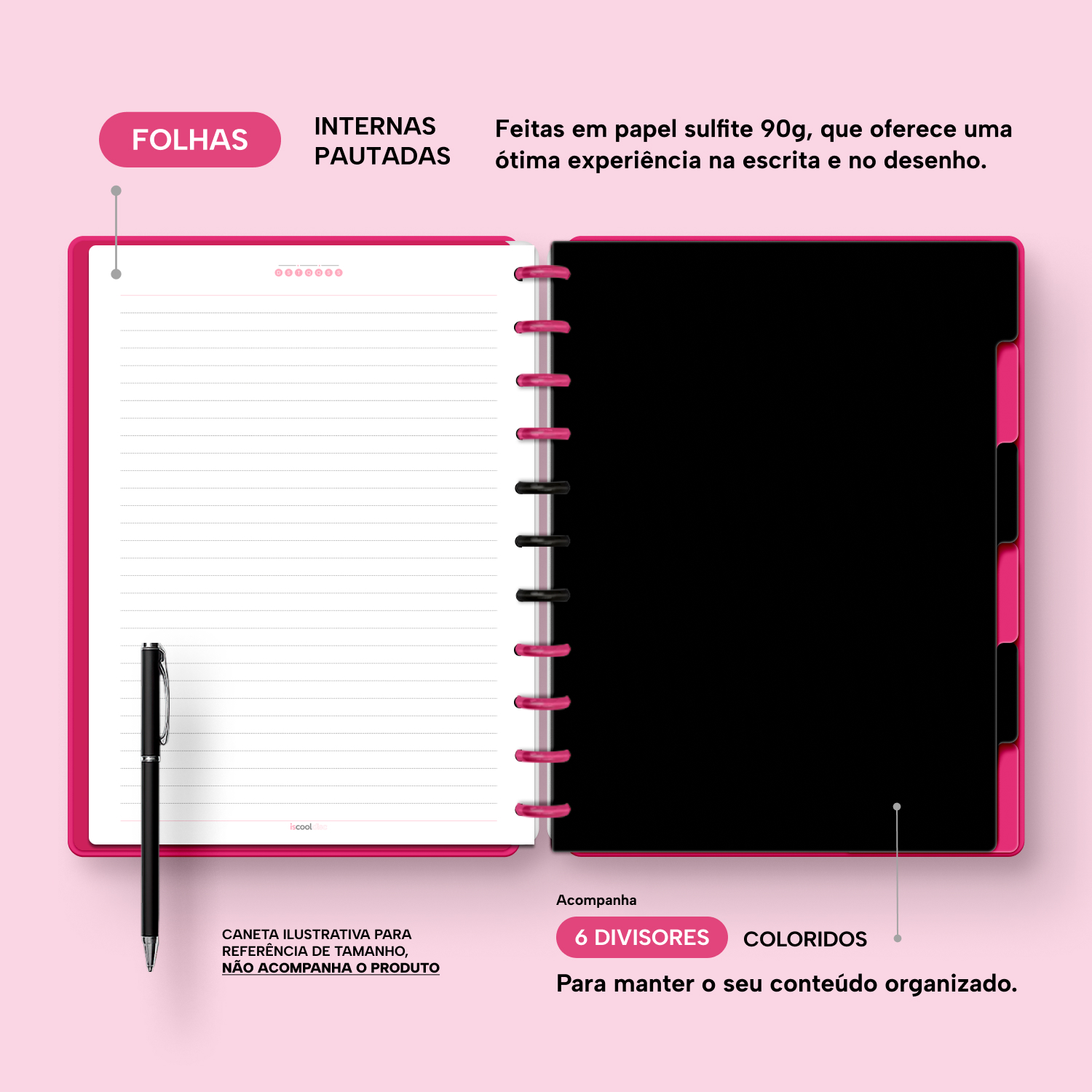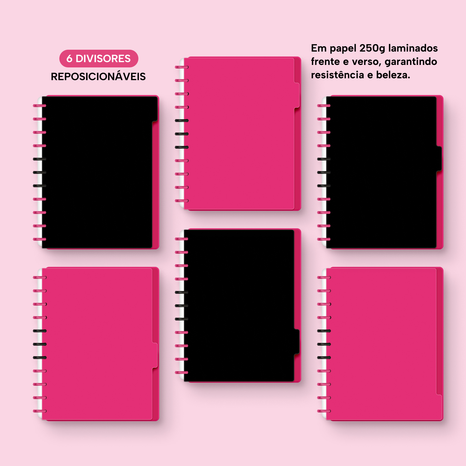 A capa é dura, com impressão digital de alta definição, e acompanha 6 lindas divisórias que você pode colocar em qualquer local do caderno, funcionando como o guia perfeito para sua organização.