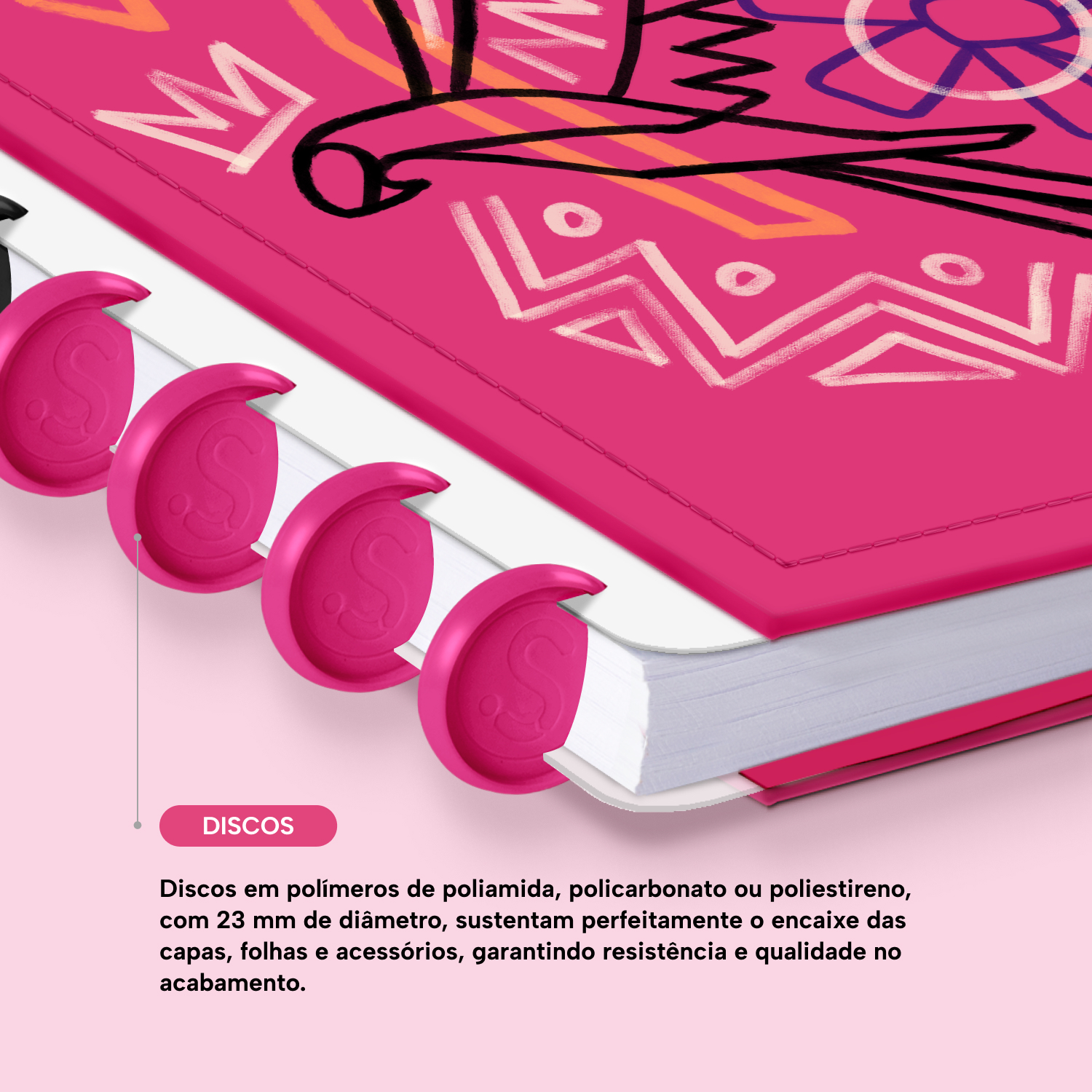 Os nossos discos são fabricados em polímero de nylon e/ou policarbonato. Podem ser substituídos, proporcionando imensa variedade na combinação das cores, qualidade no acabamento e eficácia no encaixe das capas, folhas e acessórios.