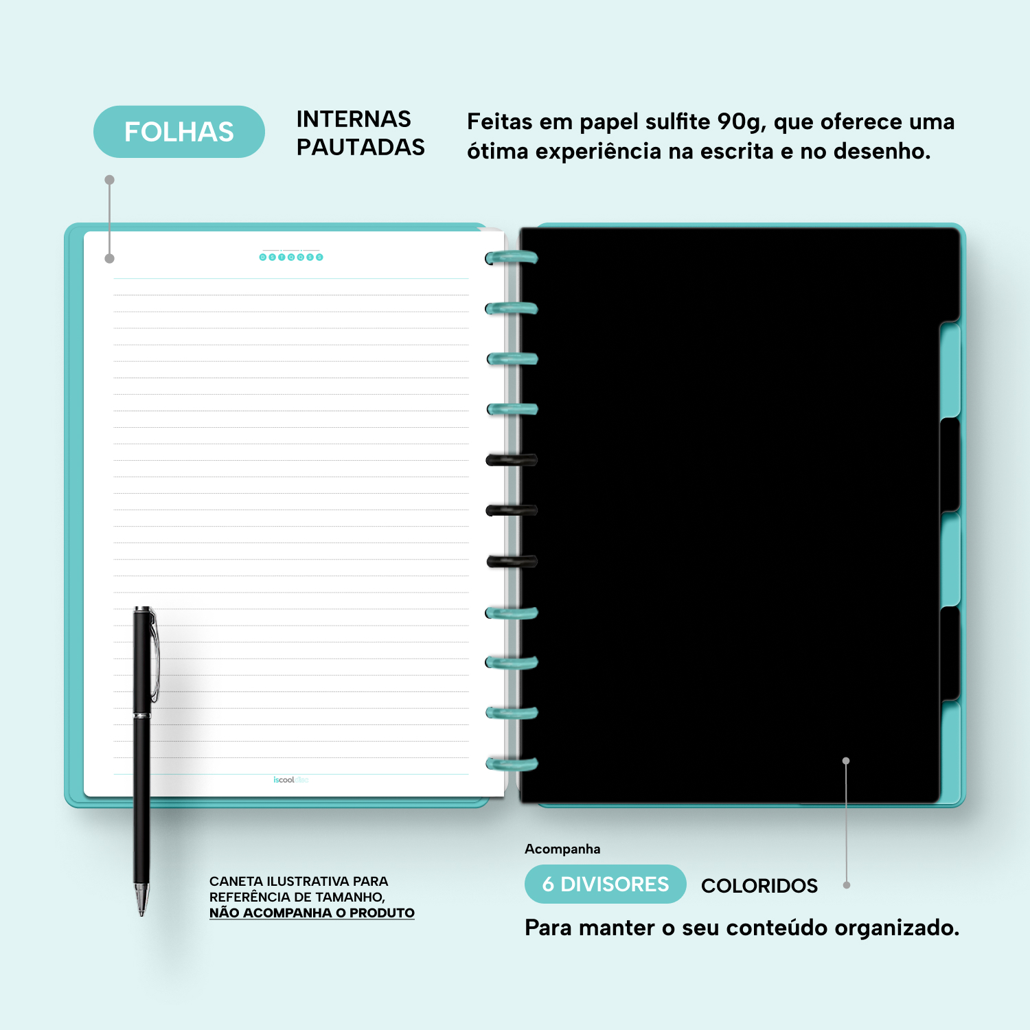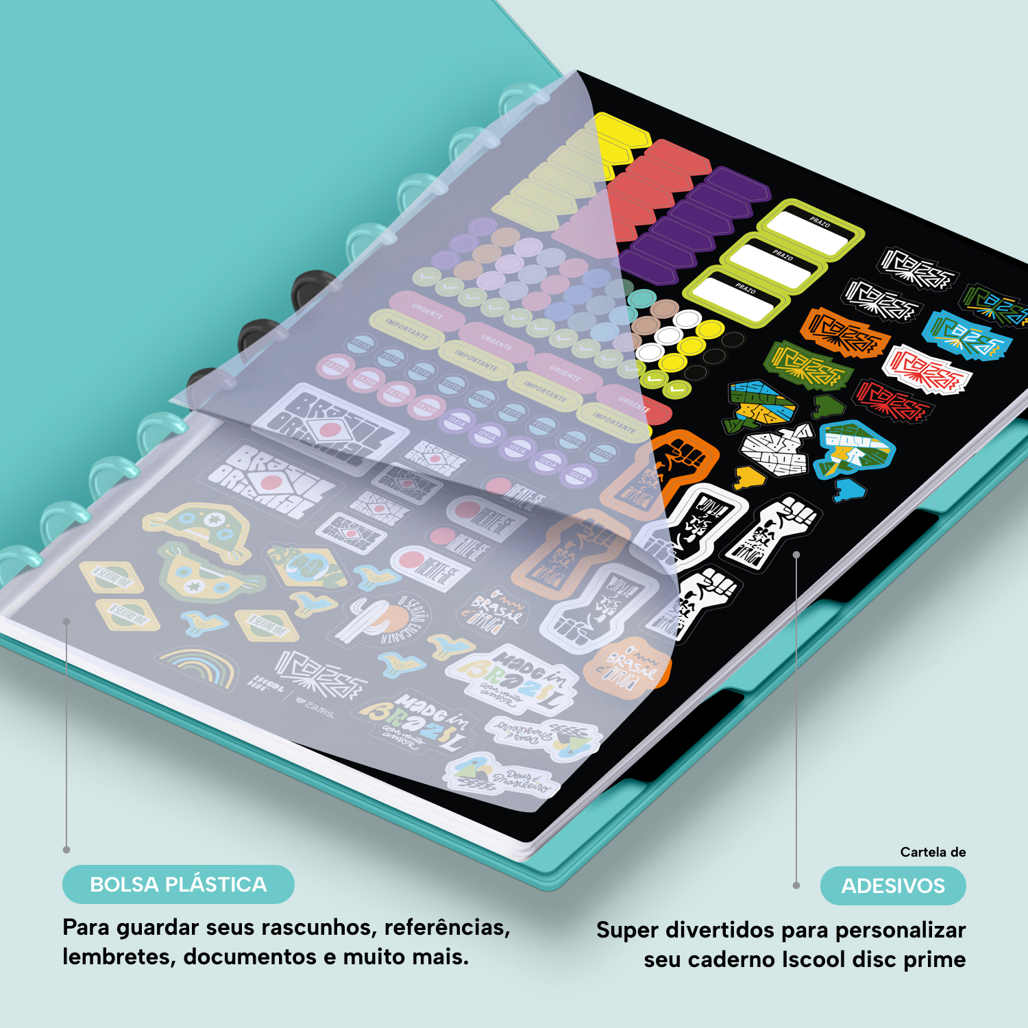 Além de tudo isso, o iscooldisc Prime conta com detalhes que fazem toda a diferença: elástico para fechamento da capa, muito mais estilo e privacidade para suas anotações; bolsa plástica para guardar seus rascunhos, referências, lembretes, documentos e uma cartela de adesivos incríveis, para que você possa personalizar seu caderno do seu jeitinho!