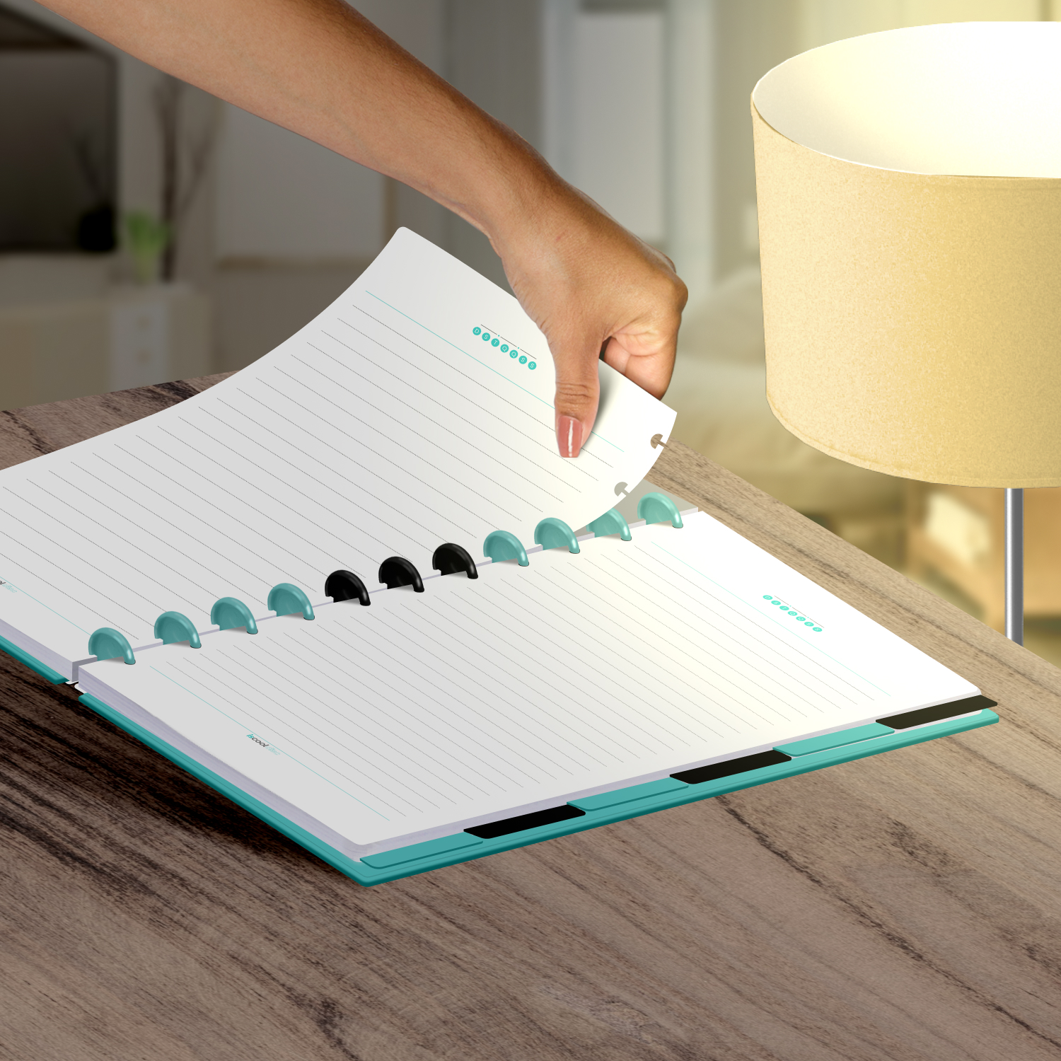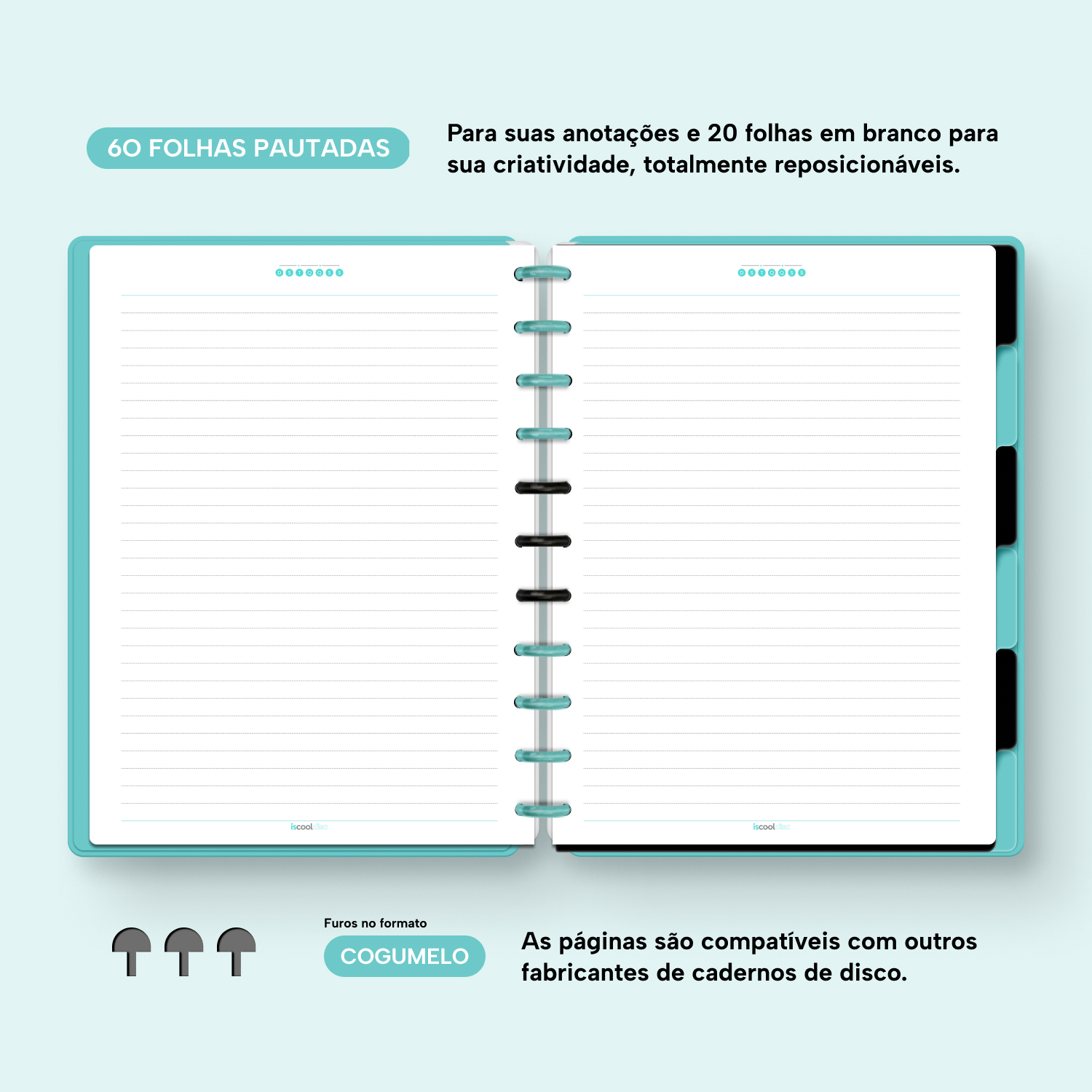Com furos no formato de “cogumelo”, você poderá dar um “up” em seu caderno com nossos refis, além de ser compatível com outros fabricantes de cadernos de discos.