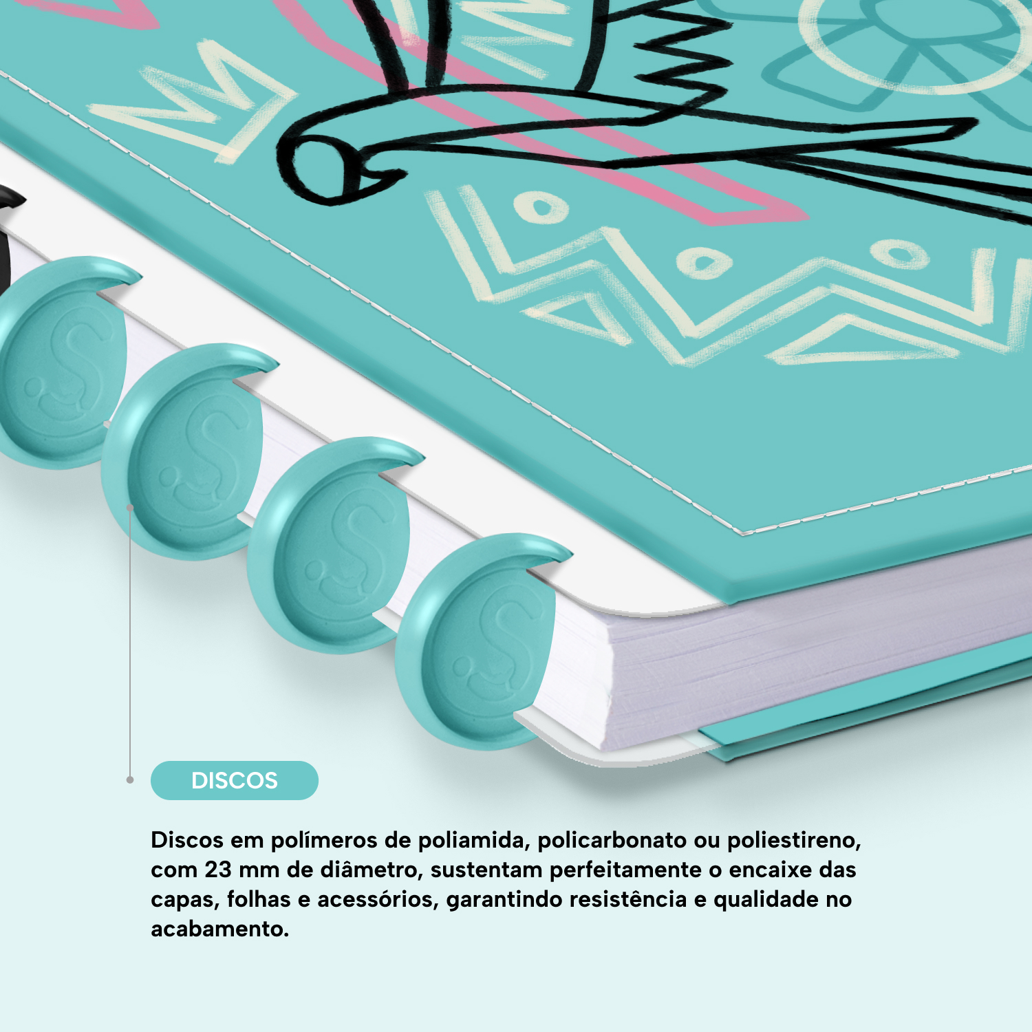 Encadernado com 11 discos M de 23mm em polímero de nylon e/ou policarbonato coloridos, fabricados no Brasil.
