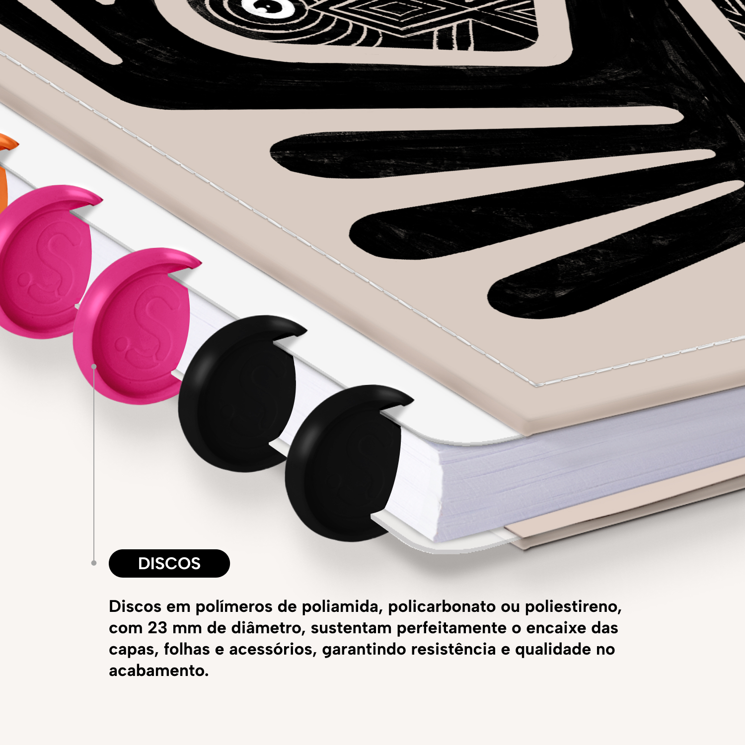 Encadernado com 11 discos M de 23mm em polímero de nylon e/ou policarbonato coloridos, fabricados no Brasil.