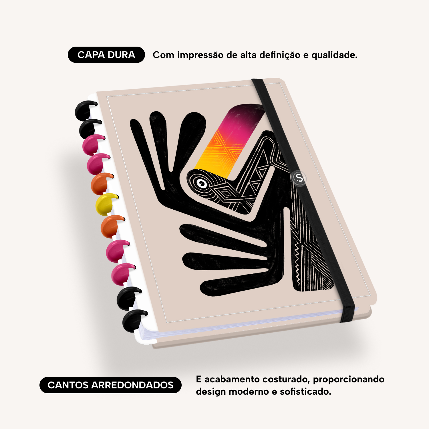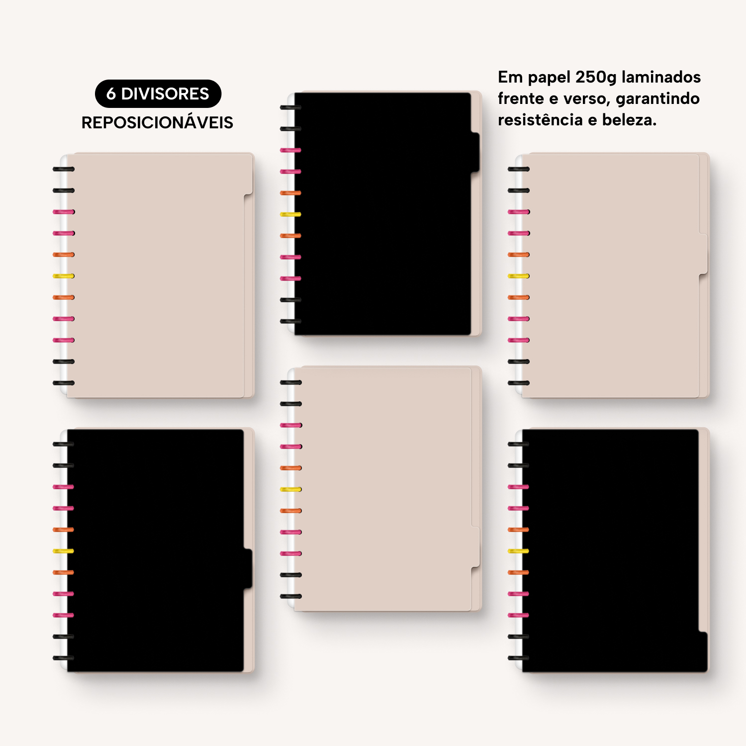 A capa é dura, com impressão digital de alta definição, e acompanha 6 lindas divisórias que você pode colocar em qualquer local do caderno, funcionando como o guia perfeito para sua organização.
