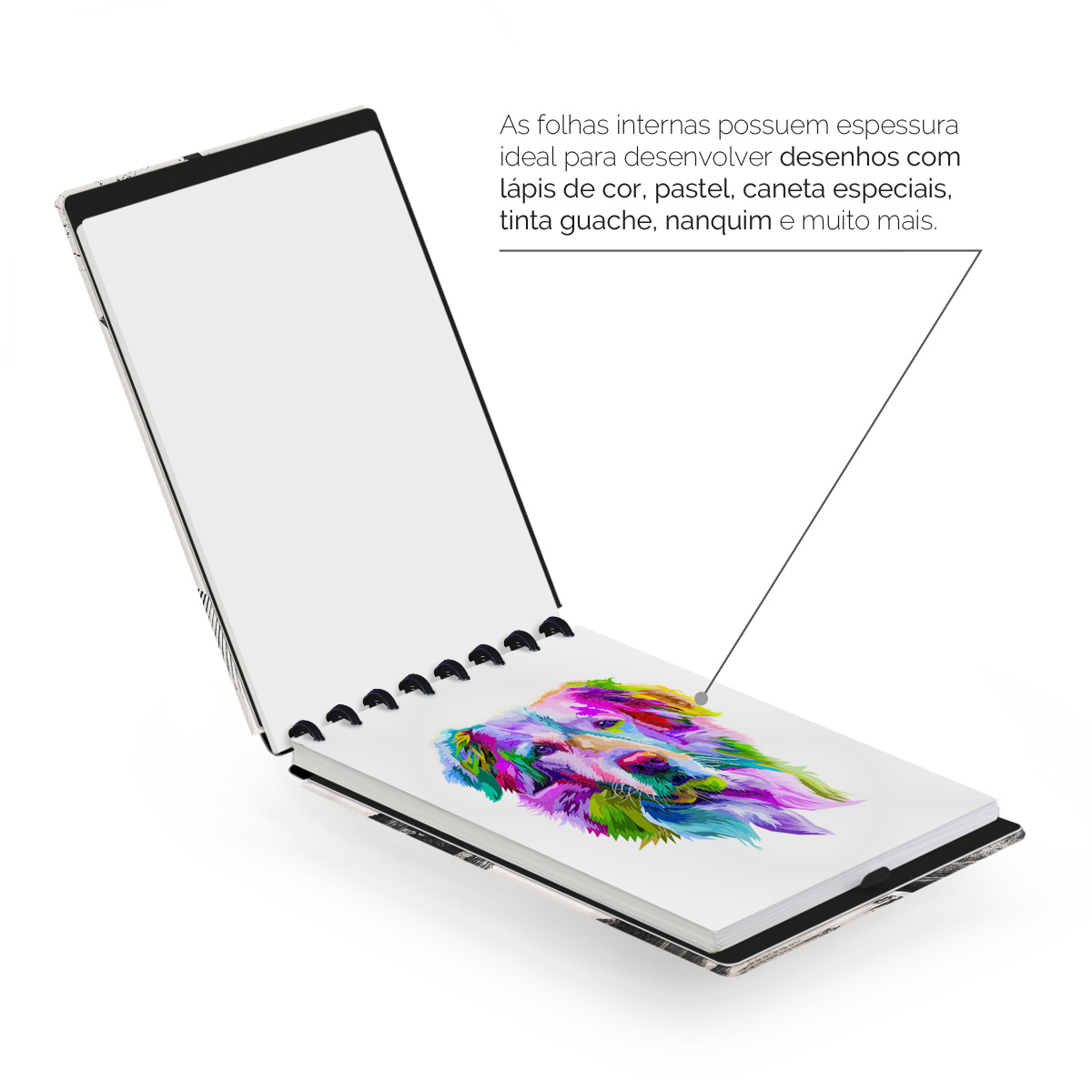 A capa dura do Sketchbook é revestida com laminação BOPP, dando assim um toque sofisticado e um visual com estilo único. Ela é impressa com tecnologia digital UV de alta definição de imagens, onde os detalhes são reproduzidos com riqueza e vivacidade!