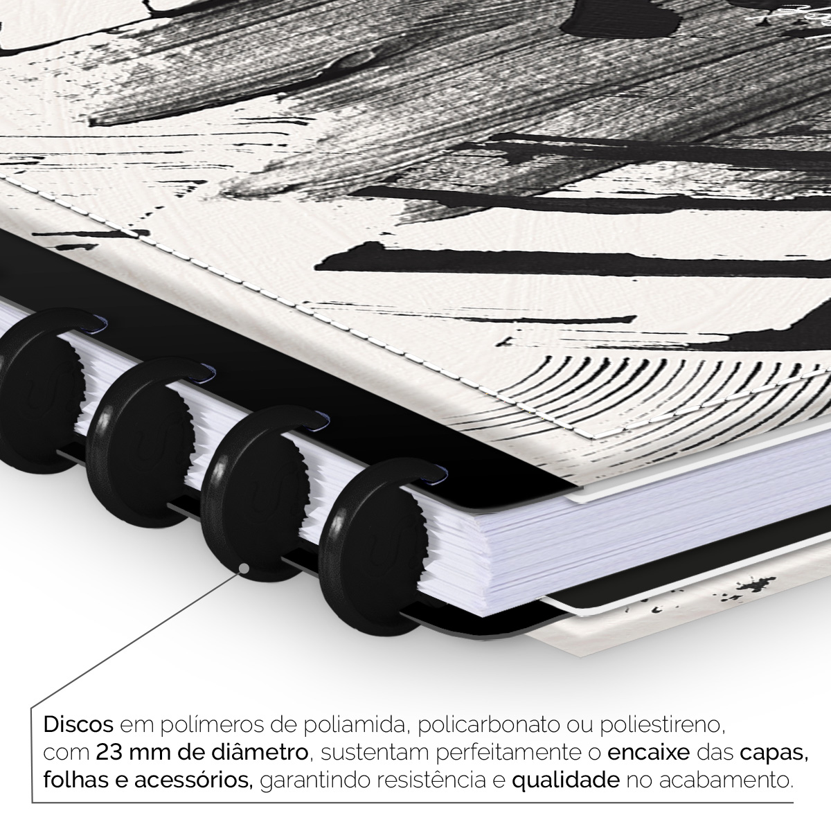 Encadernado com 8 discos M de 23mm em polímero de nylon e/ou policarbonato coloridos, fabricados no Brasil.