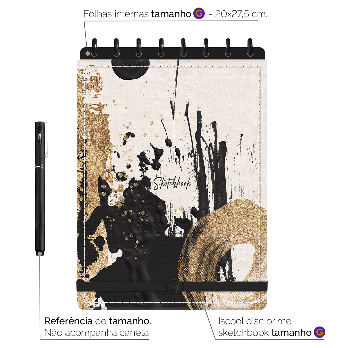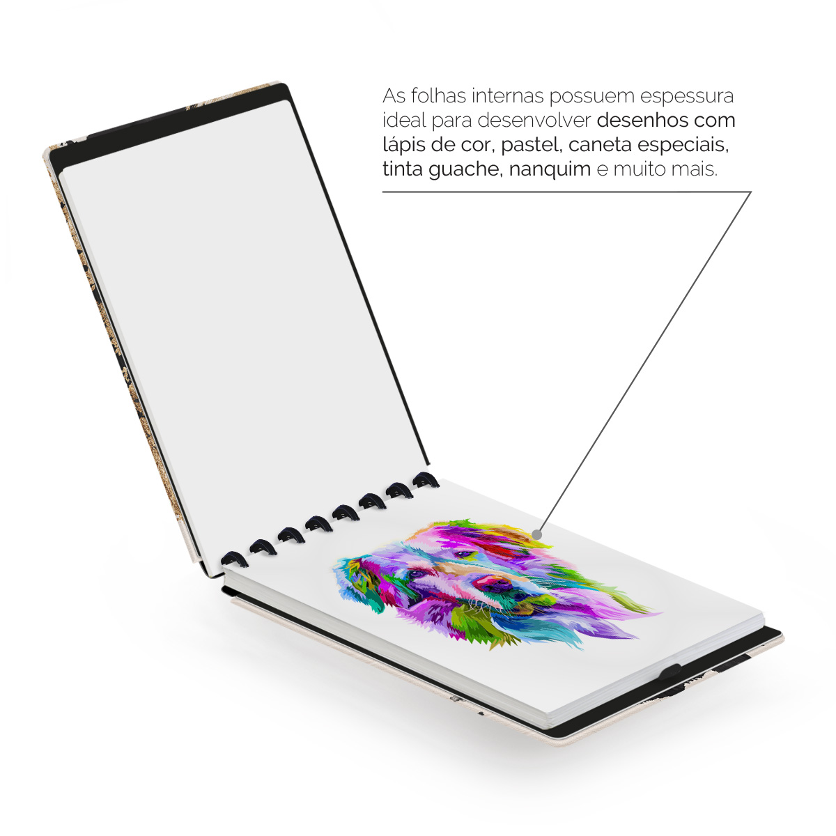 Na medida de 20x27,5 cm (G), ele possui 40 folhas (80 páginas) em papel branco alcalino (acid free) com gramatura de 180g/m². As folhas internas removíveis possuem espessura ideal para desenvolver desenhos com lápis de cor, pastel, caneta, tinta guache e até nanquim!