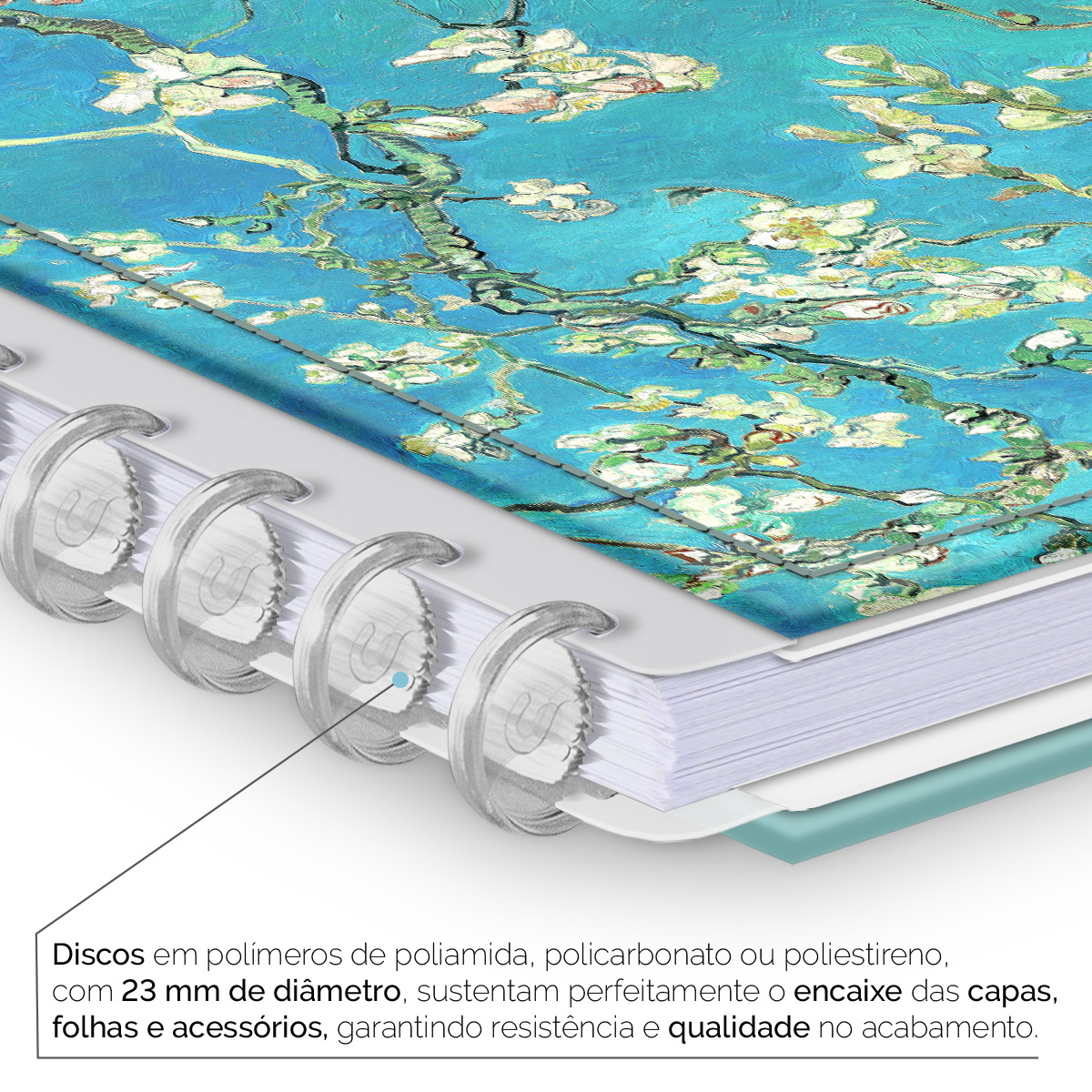 Encadernado com 8 discos M de 23mm em polímero de nylon e/ou policarbonato coloridos, fabricados no Brasil.
