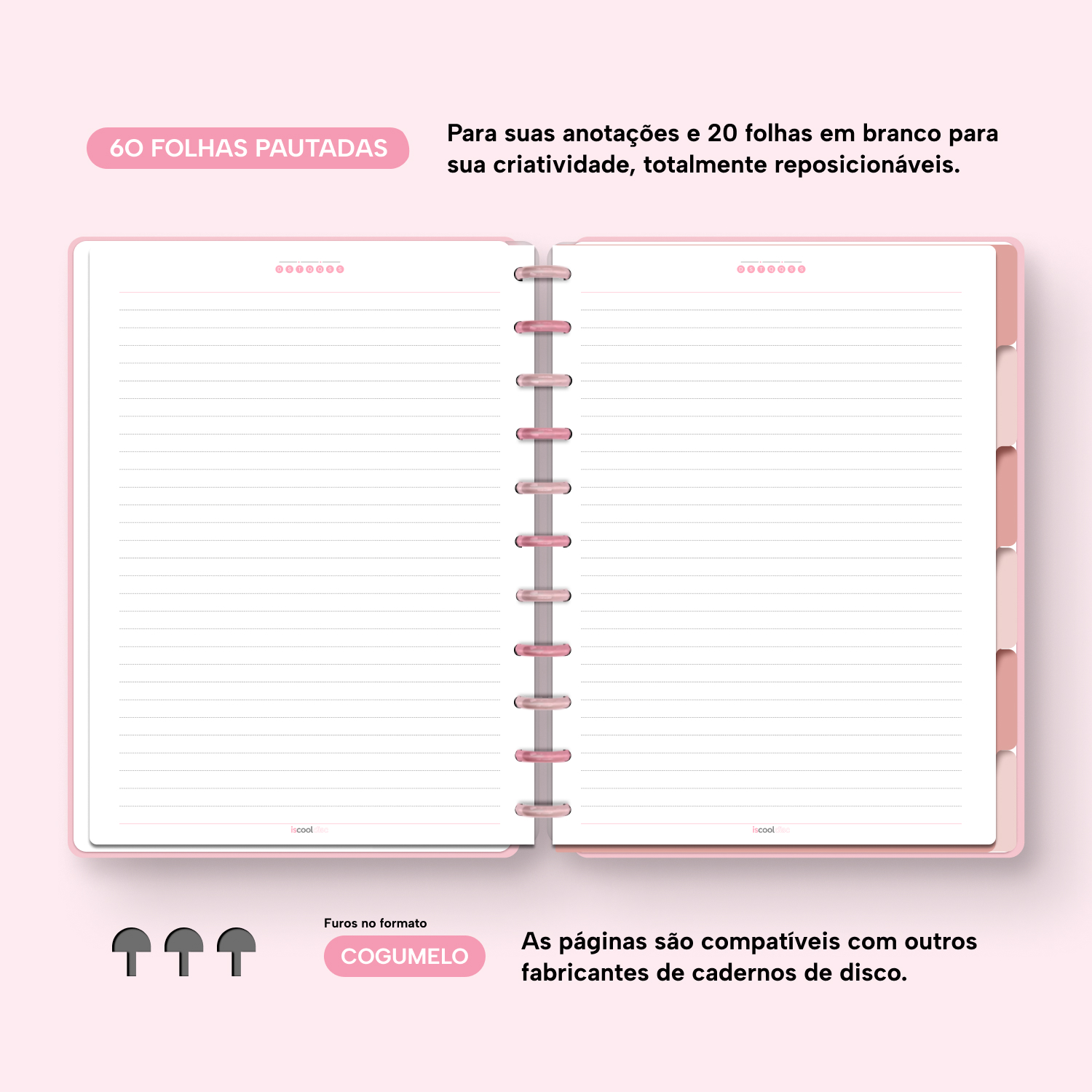 Com furos no formato de “cogumelo”, você poderá dar um “up” em seu caderno com nossos refis, além de ser compatível com outros fabricantes de cadernos de discos.