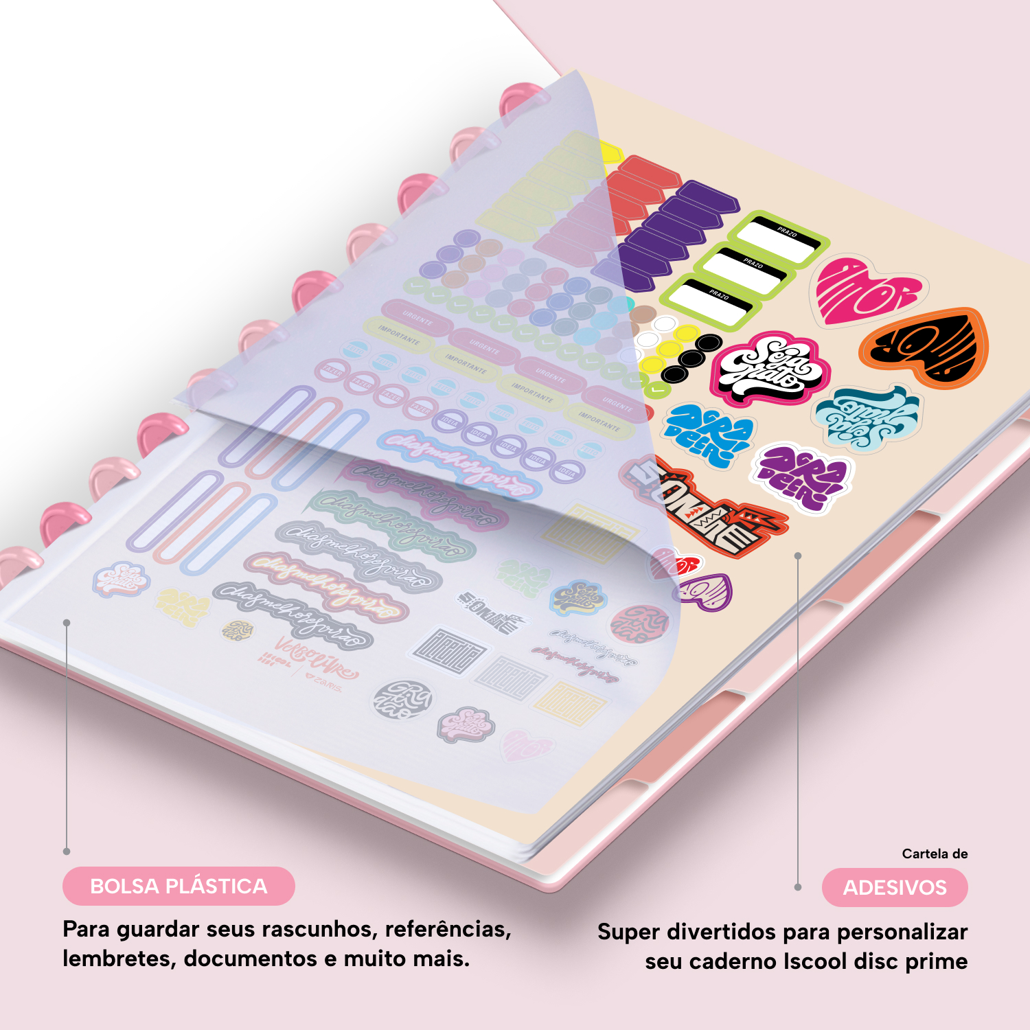 Além de tudo isso, o iscooldisc Prime conta com detalhes que fazem toda a diferença: elástico para fechamento da capa, muito mais estilo e privacidade para suas anotações; bolsa plástica para guardar seus rascunhos, referências, lembretes, documentos e uma cartela de adesivos incríveis, para que você possa personalizar seu caderno do seu jeitinho!