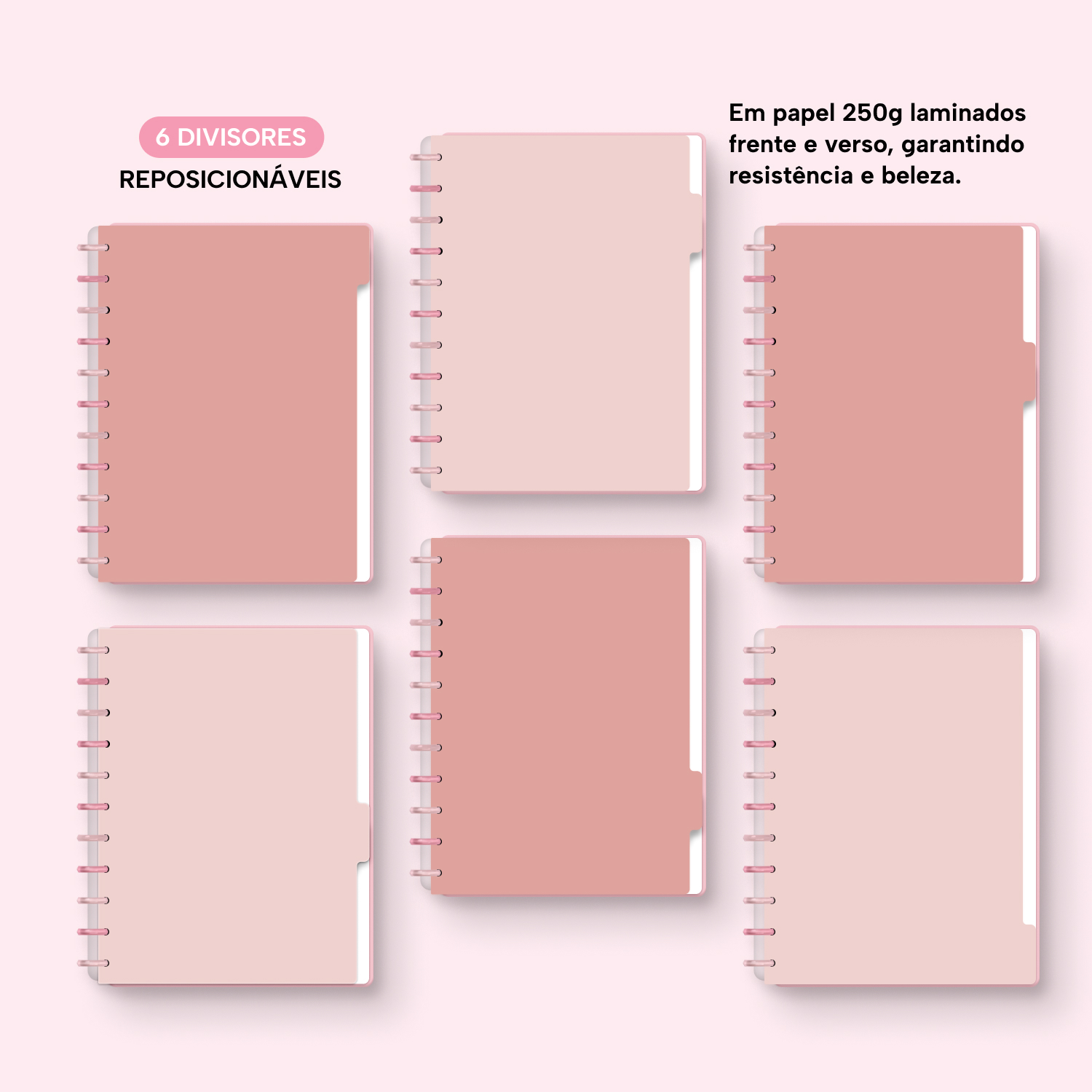 A capa é dura, com impressão digital de alta definição, e acompanha 6 lindas divisórias que você pode colocar em qualquer local do caderno, funcionando como o guia perfeito para sua organização.