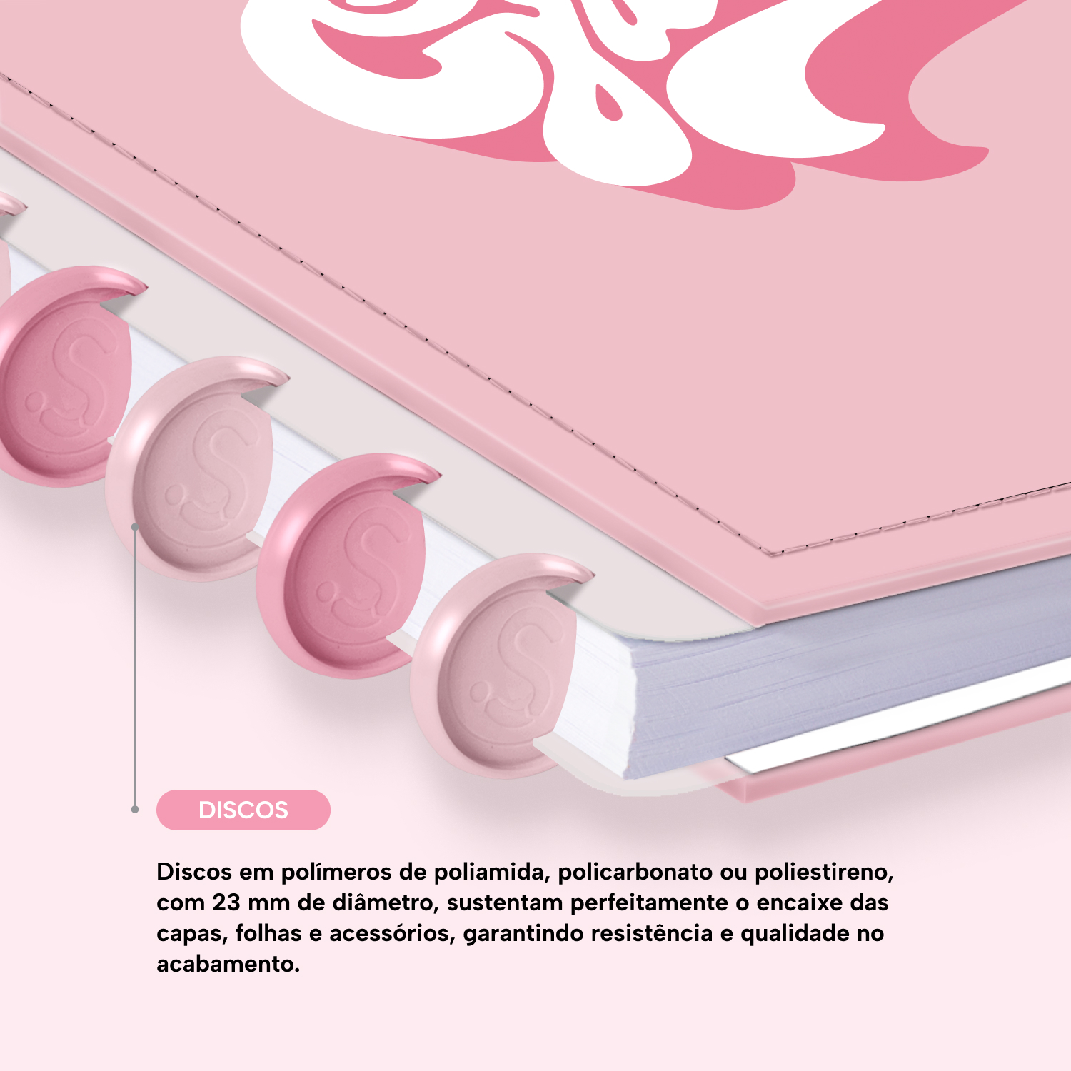 Os nossos discos são fabricados em polímero de nylon e/ou policarbonato. Podem ser substituídos, proporcionando imensa variedade na combinação das cores, qualidade no acabamento e eficácia no encaixe das capas, folhas e acessórios.