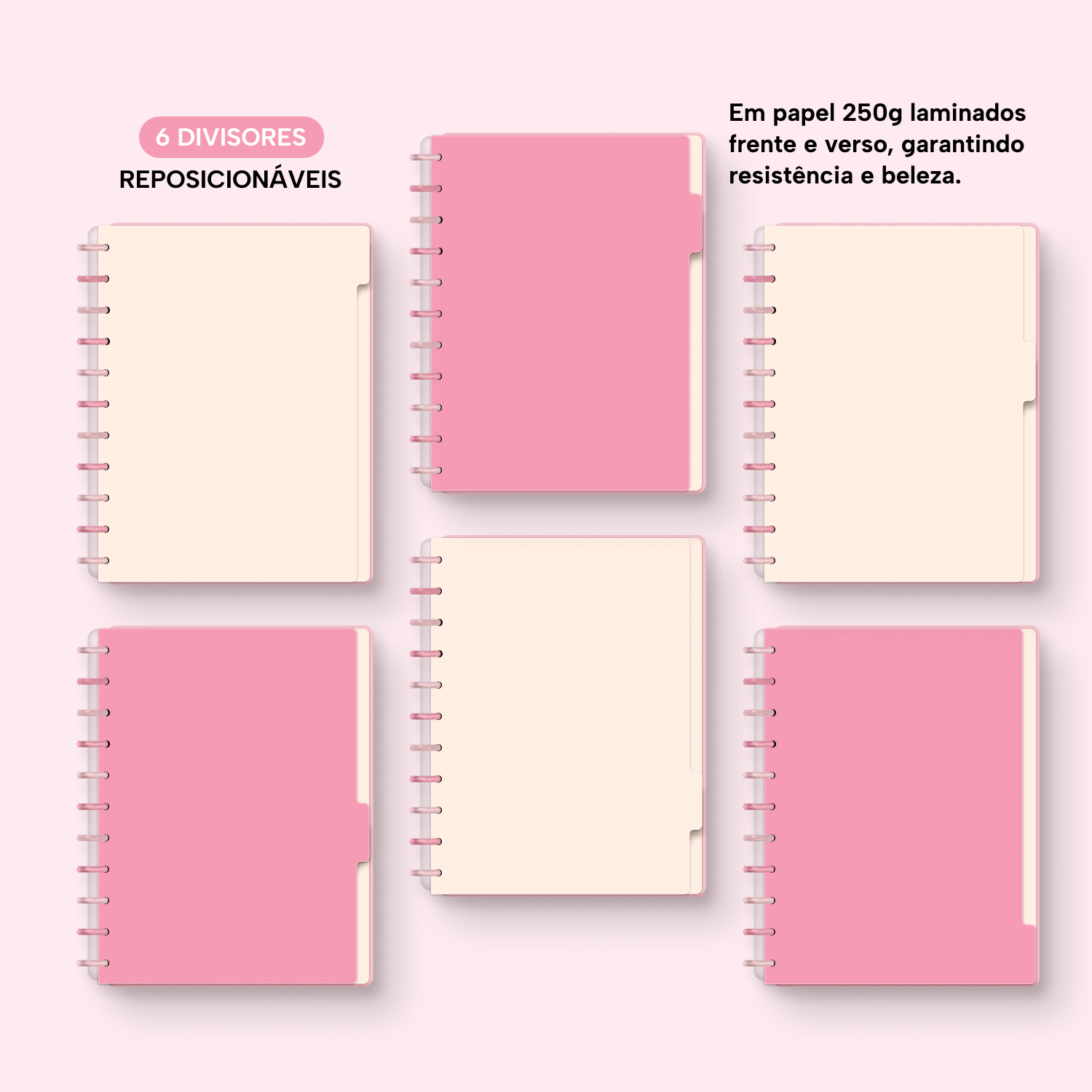 A capa é dura, com impressão digital de alta definição, e acompanha 6 lindas divisórias que você pode colocar em qualquer local do caderno, funcionando como o guia perfeito para sua organização.