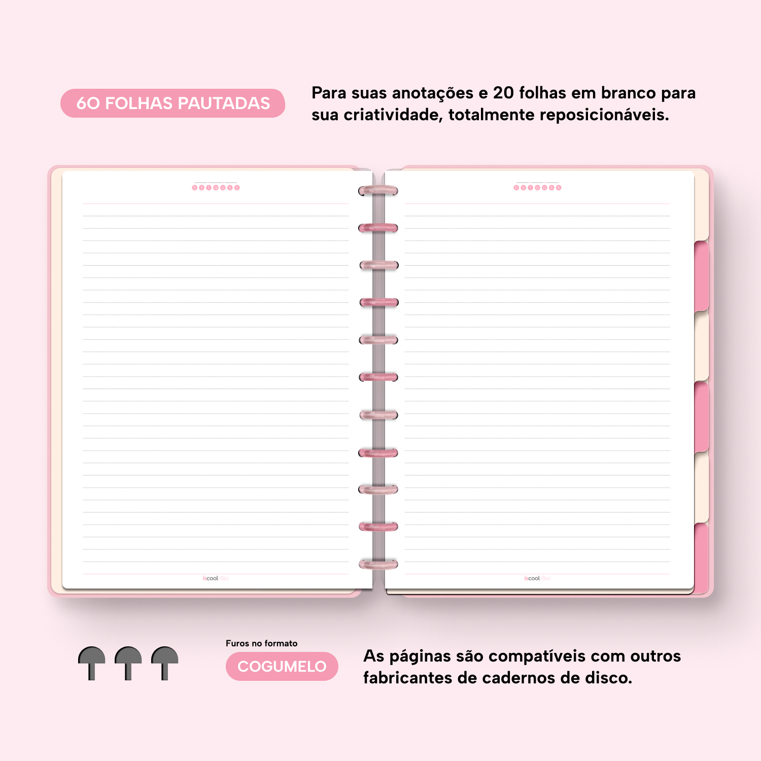 O miolo conta com 60 folhas pautadas decoradas em papel sulfite 90g (aquele papel mais “grossinho”) para que você use e abuse das suas canetas especiais, e 20 folhas em branco, ideais para explorar seu lado mais criativo ou até imprimir nelas.