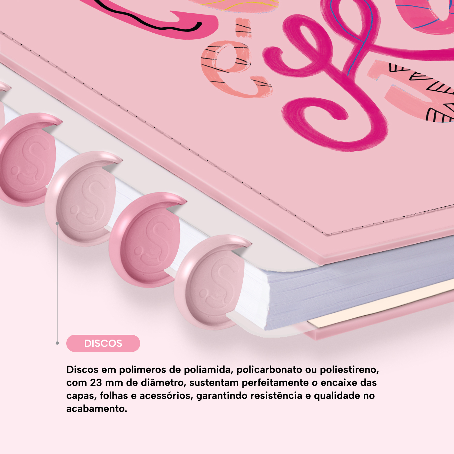 Encadernado com 11 discos M de 23mm em polímero de nylon e/ou policarbonato coloridos, fabricados no Brasil.