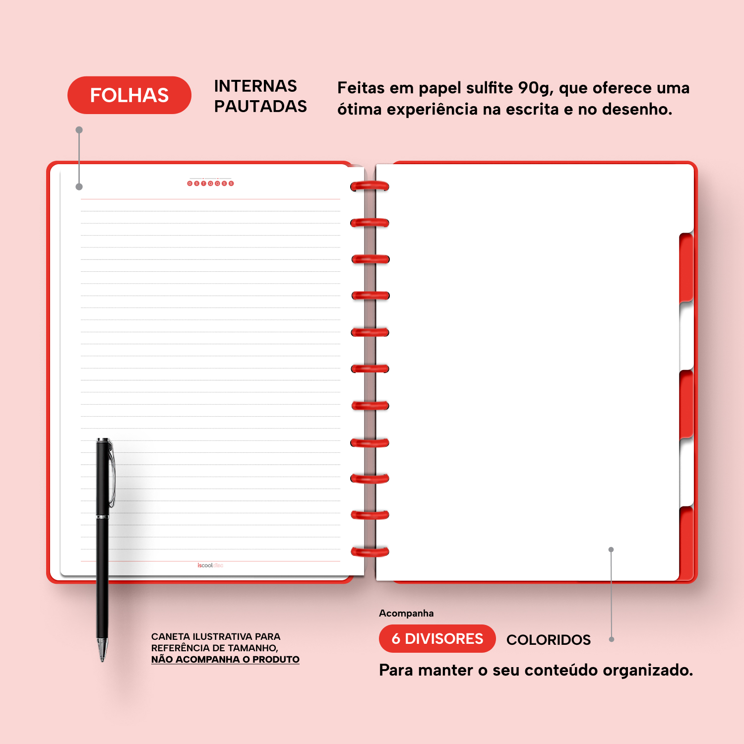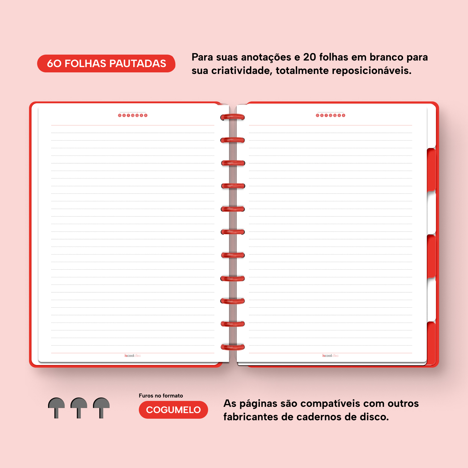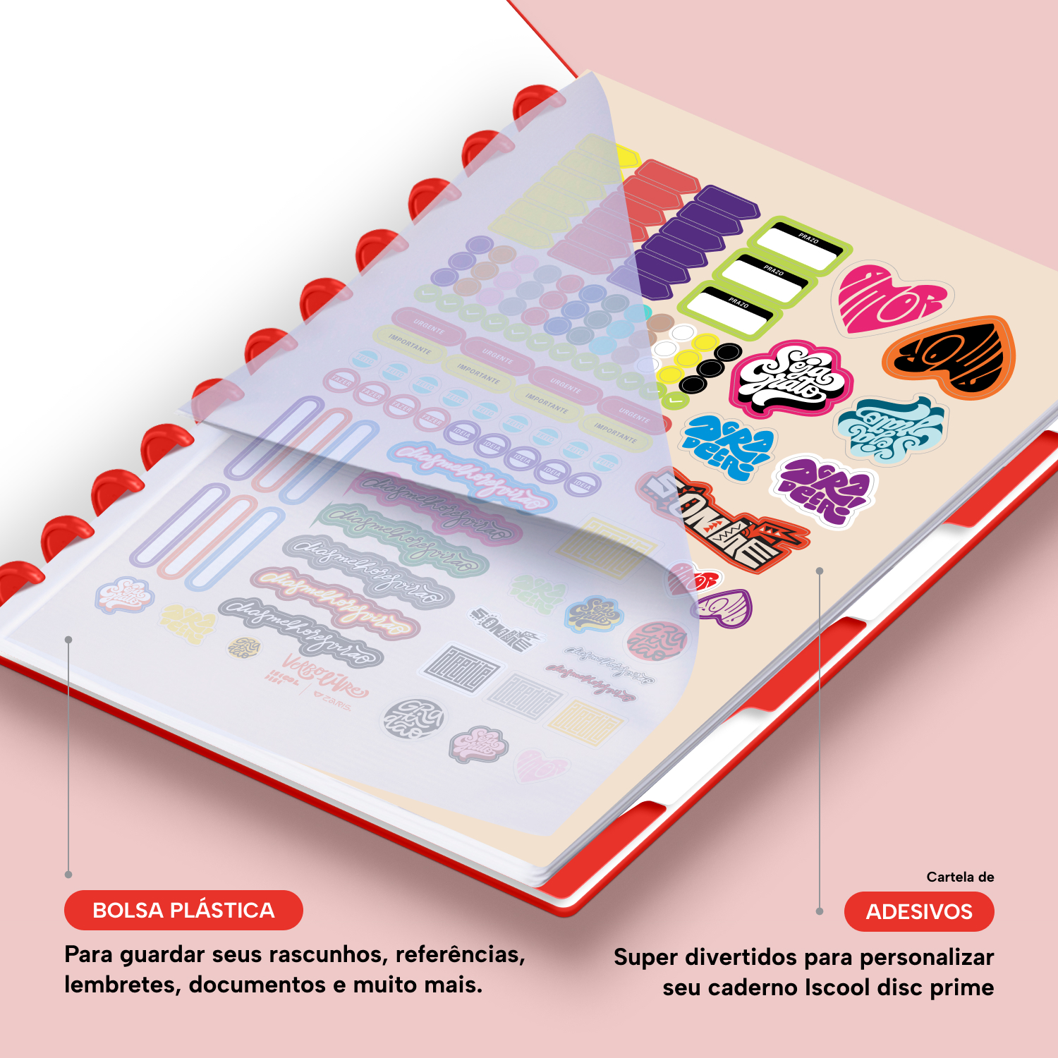 Além de tudo isso, o iscooldisc Prime conta com detalhes que fazem toda a diferença: elástico para fechamento da capa, muito mais estilo e privacidade para suas anotações; bolsa plástica para guardar seus rascunhos, referências, lembretes, documentos e uma cartela de adesivos incríveis, para que você possa personalizar seu caderno do seu jeitinho!