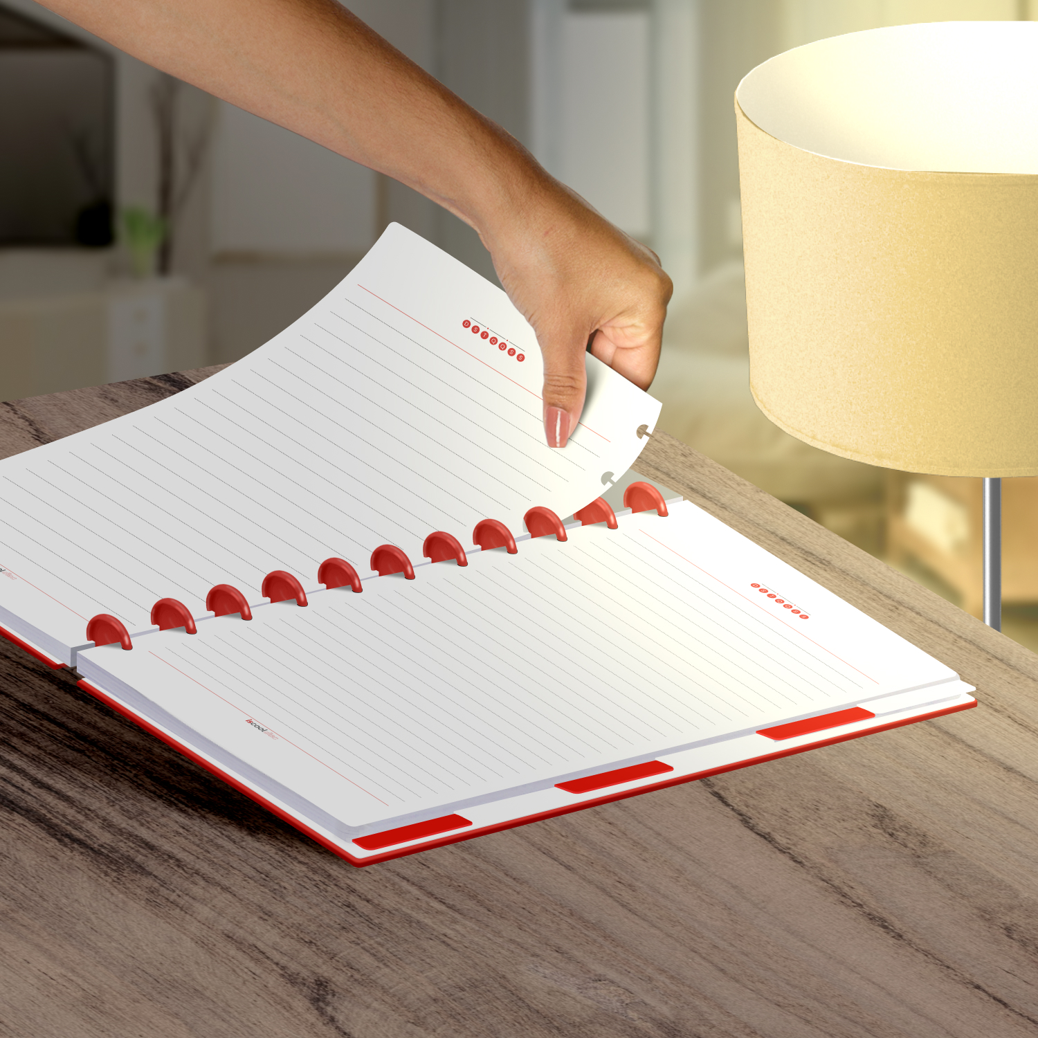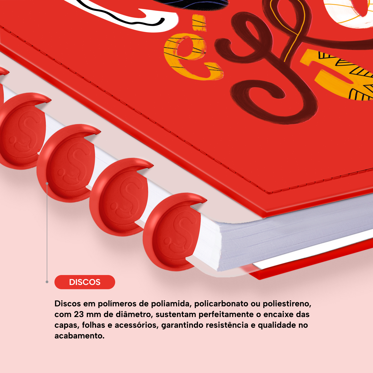 Encadernado com 11 discos M de 23mm em polímero de nylon e/ou policarbonato coloridos, fabricados no Brasil.