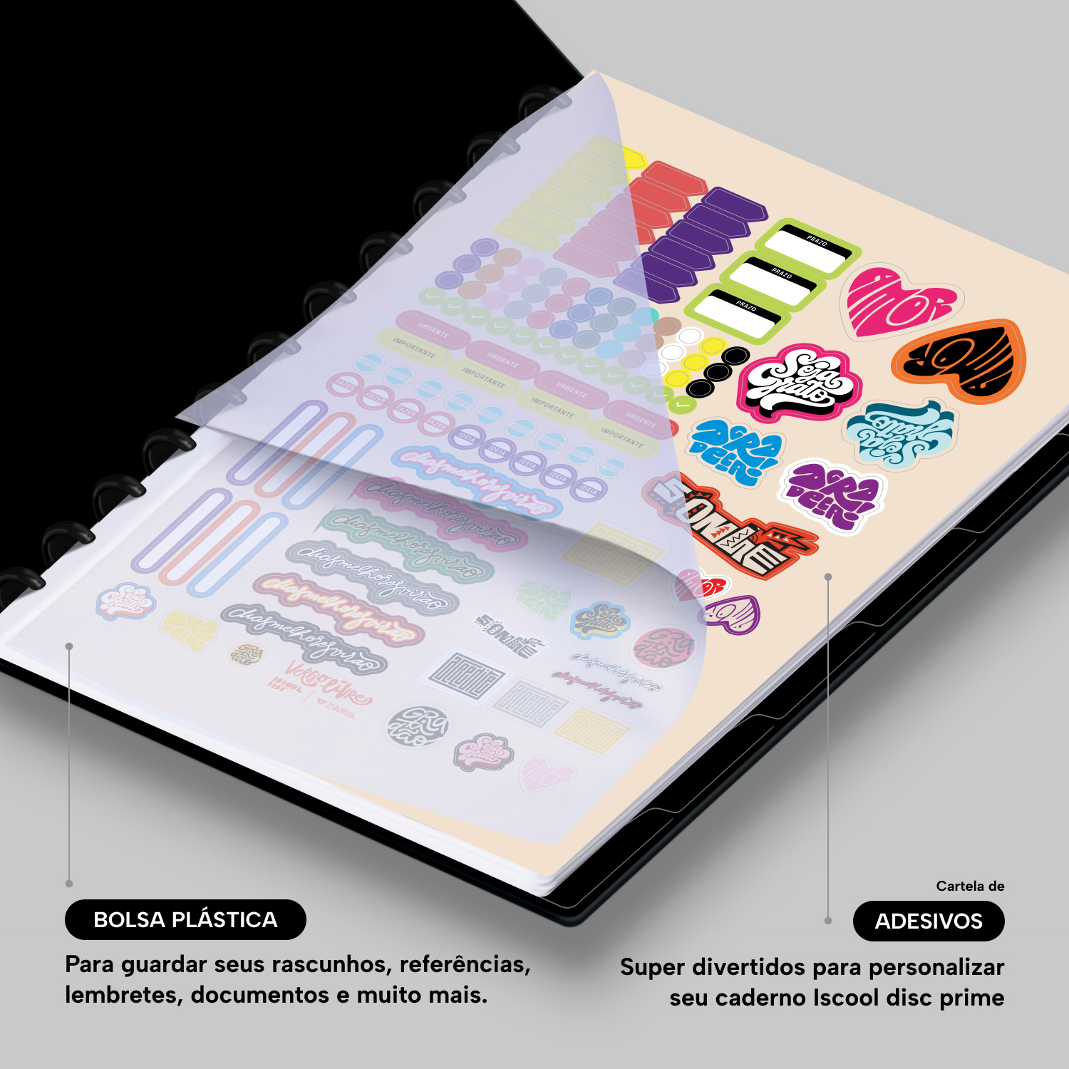 Além de tudo isso, o iscooldisc Prime conta com detalhes que fazem toda a diferença: elástico para fechamento da capa, muito mais estilo e privacidade para suas anotações; bolsa plástica para guardar seus rascunhos, referências, lembretes, documentos e uma cartela de adesivos incríveis, para que você possa personalizar seu caderno do seu jeitinho!