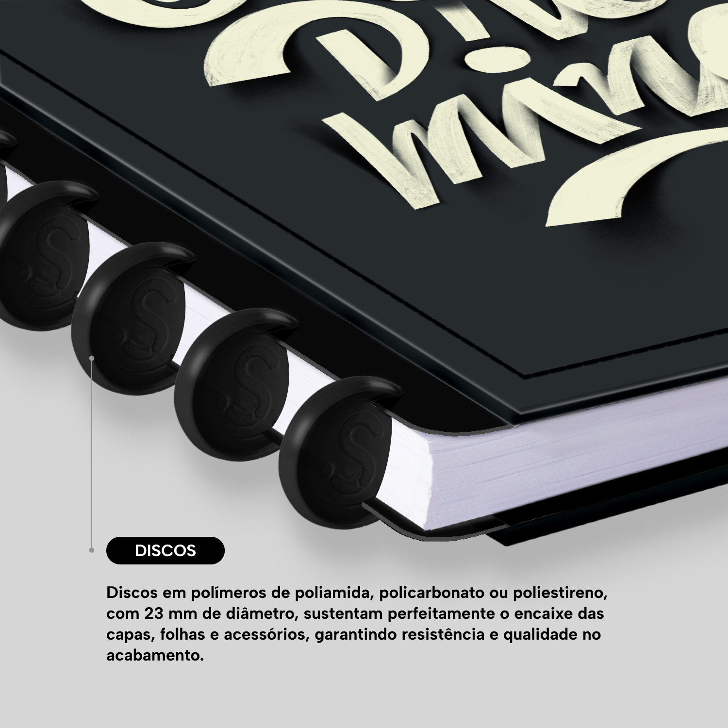 Encadernado com 11 discos M de 23mm em polímero de nylon e/ou policarbonato coloridos, fabricados no Brasil.
