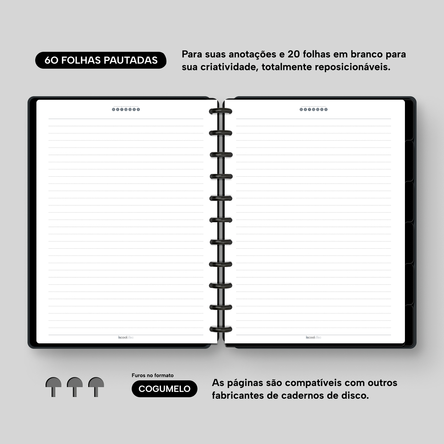 Com furos no formato de “cogumelo”, você poderá dar um “up” em seu caderno com nossos refis, além de ser compatível com outros fabricantes de cadernos de discos.