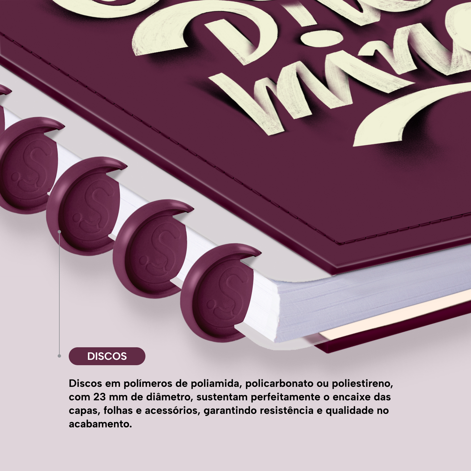 Encadernado com 11 discos M de 23mm em polímero de nylon e/ou policarbonato coloridos, fabricados no Brasil.