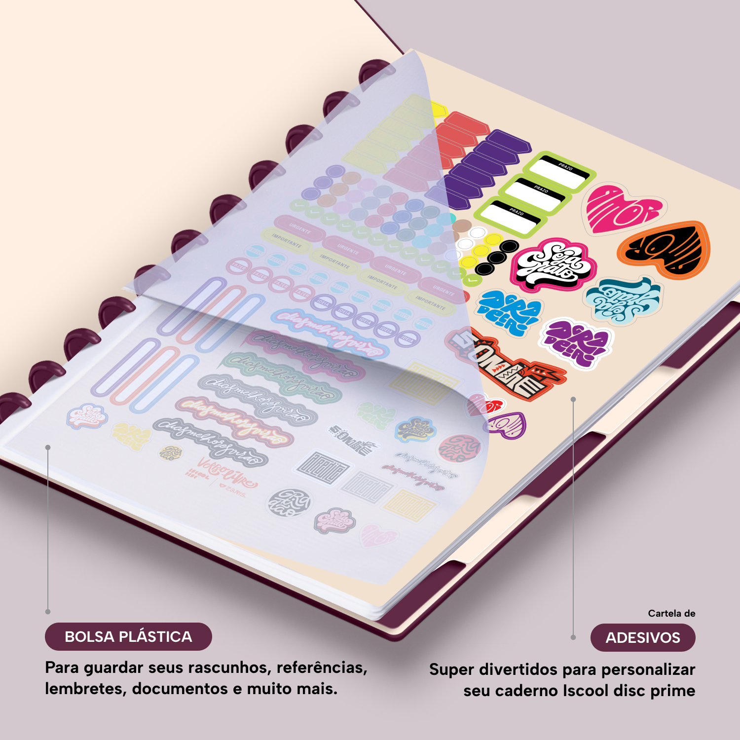 Além de tudo isso, o iscooldisc Prime conta com detalhes que fazem toda a diferença: elástico para fechamento da capa, muito mais estilo e privacidade para suas anotações; bolsa plástica para guardar seus rascunhos, referências, lembretes, documentos e uma cartela de adesivos incríveis, para que você possa personalizar seu caderno do seu jeitinho!