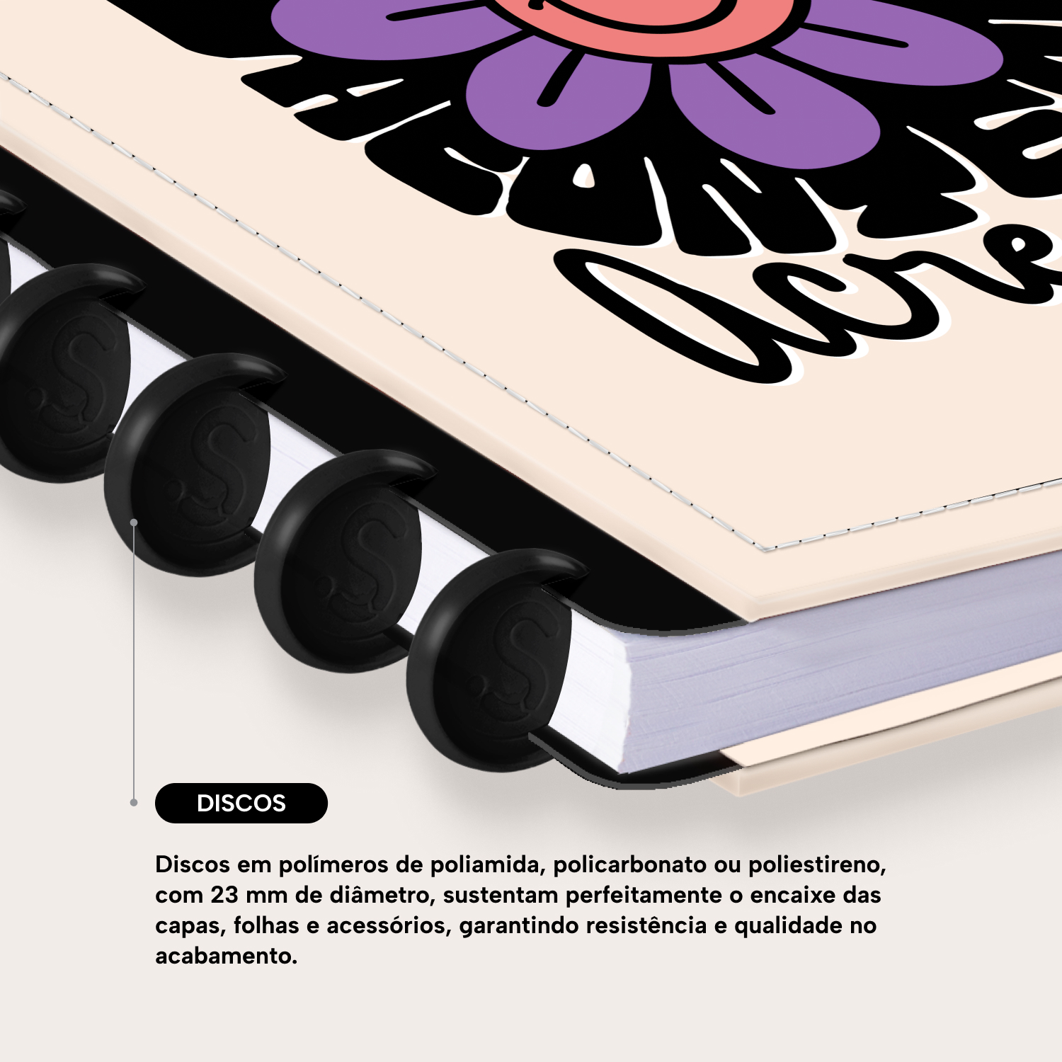 Encadernado com 11 discos M de 23mm em polímero de nylon e/ou policarbonato coloridos, fabricados no Brasil.