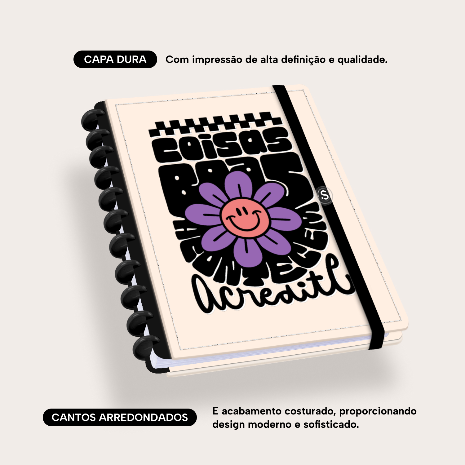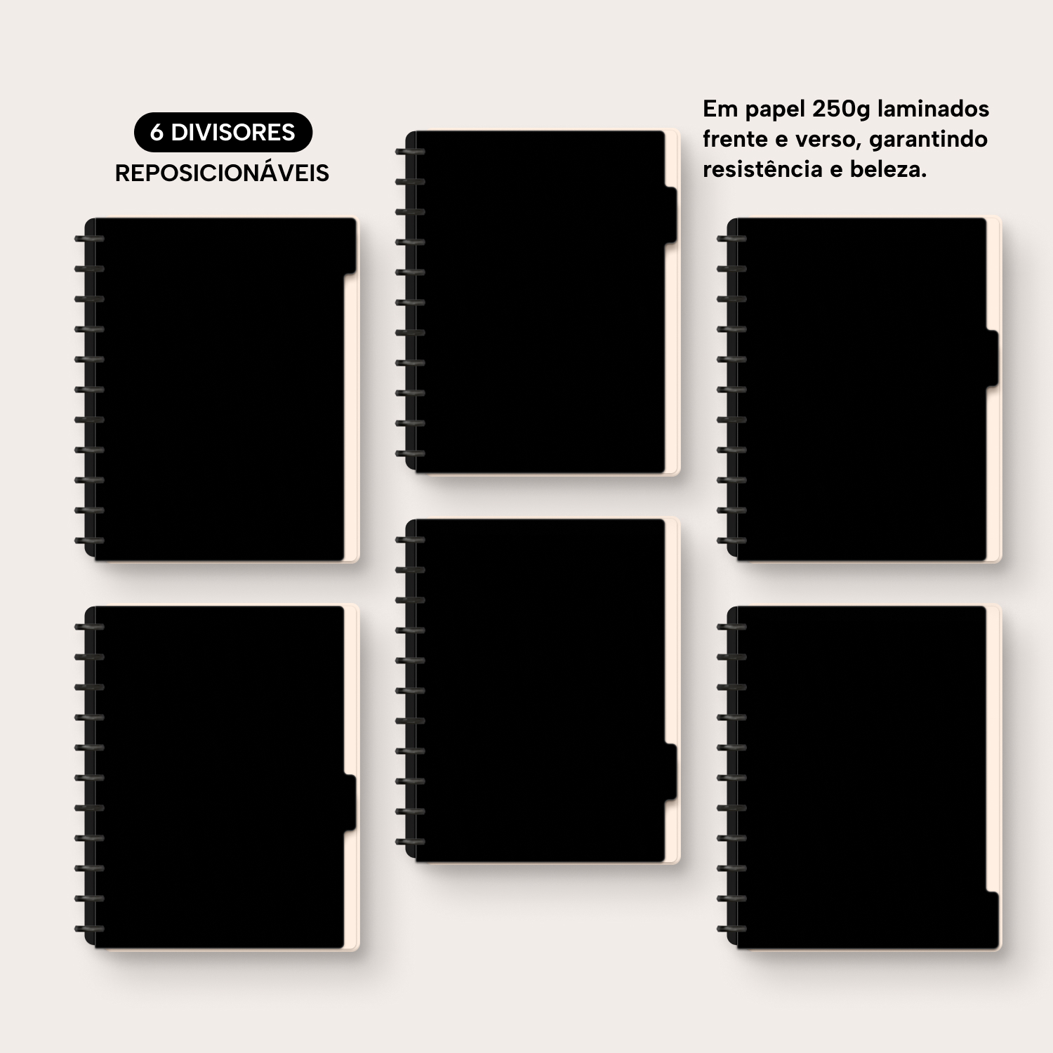 A capa é dura, com impressão digital de alta definição, e acompanha 6 lindas divisórias que você pode colocar em qualquer local do caderno, funcionando como o guia perfeito para sua organização.