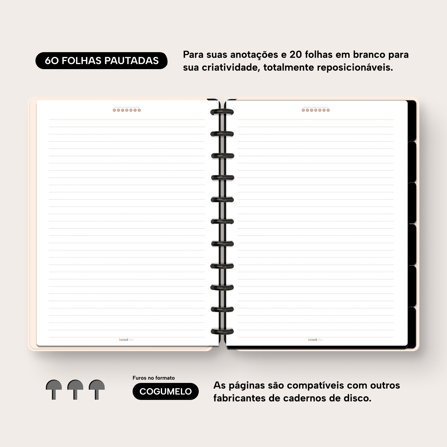Com furos no formato de “cogumelo”, você poderá dar um “up” em seu caderno com nossos refis, além de ser compatível com outros fabricantes de cadernos de discos.