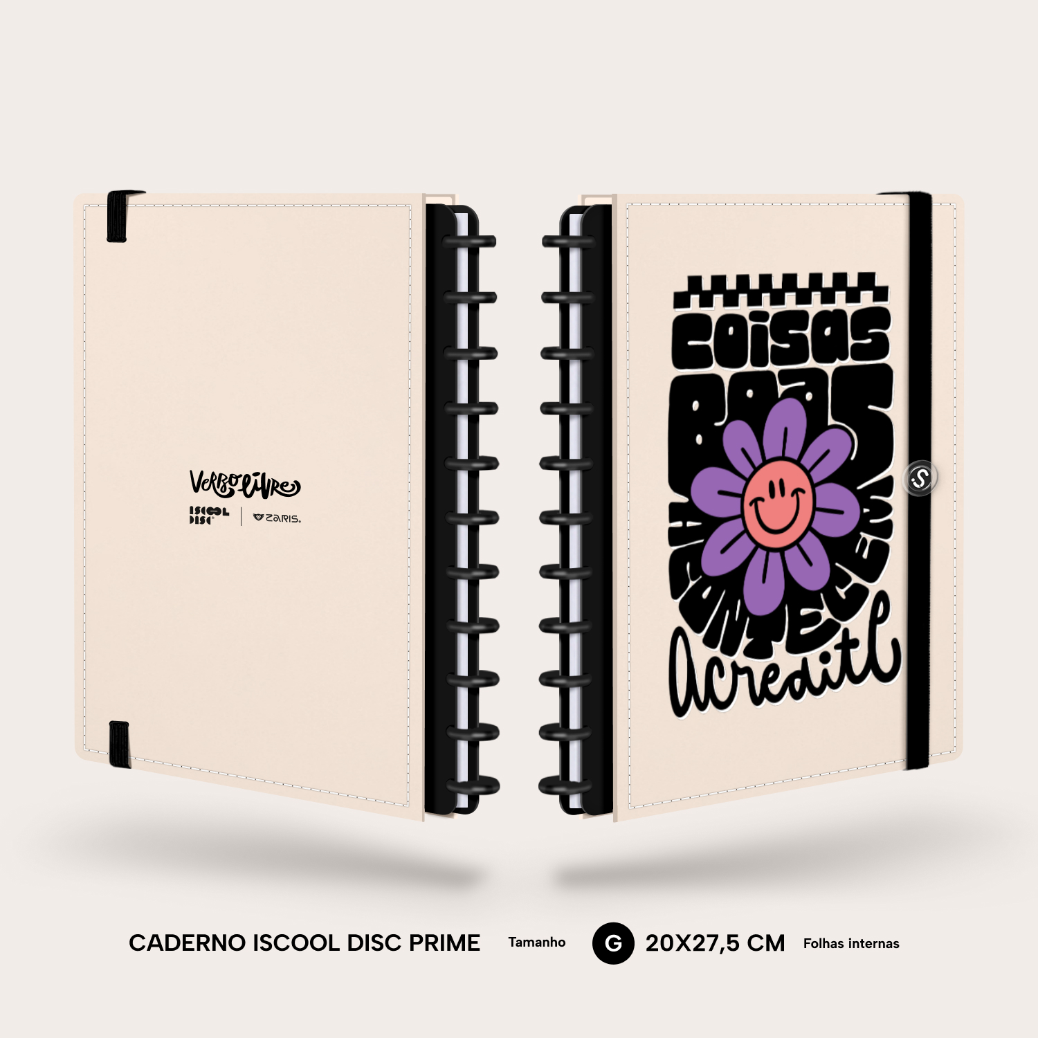 Além de tudo isso, o iscooldisc Prime conta com detalhes que fazem toda a diferença: elástico para fechamento da capa, muito mais estilo e privacidade para suas anotações; bolsa plástica para guardar seus rascunhos, referências, lembretes, documentos e uma cartela de adesivos incríveis, para que você possa personalizar seu caderno do seu jeitinho!