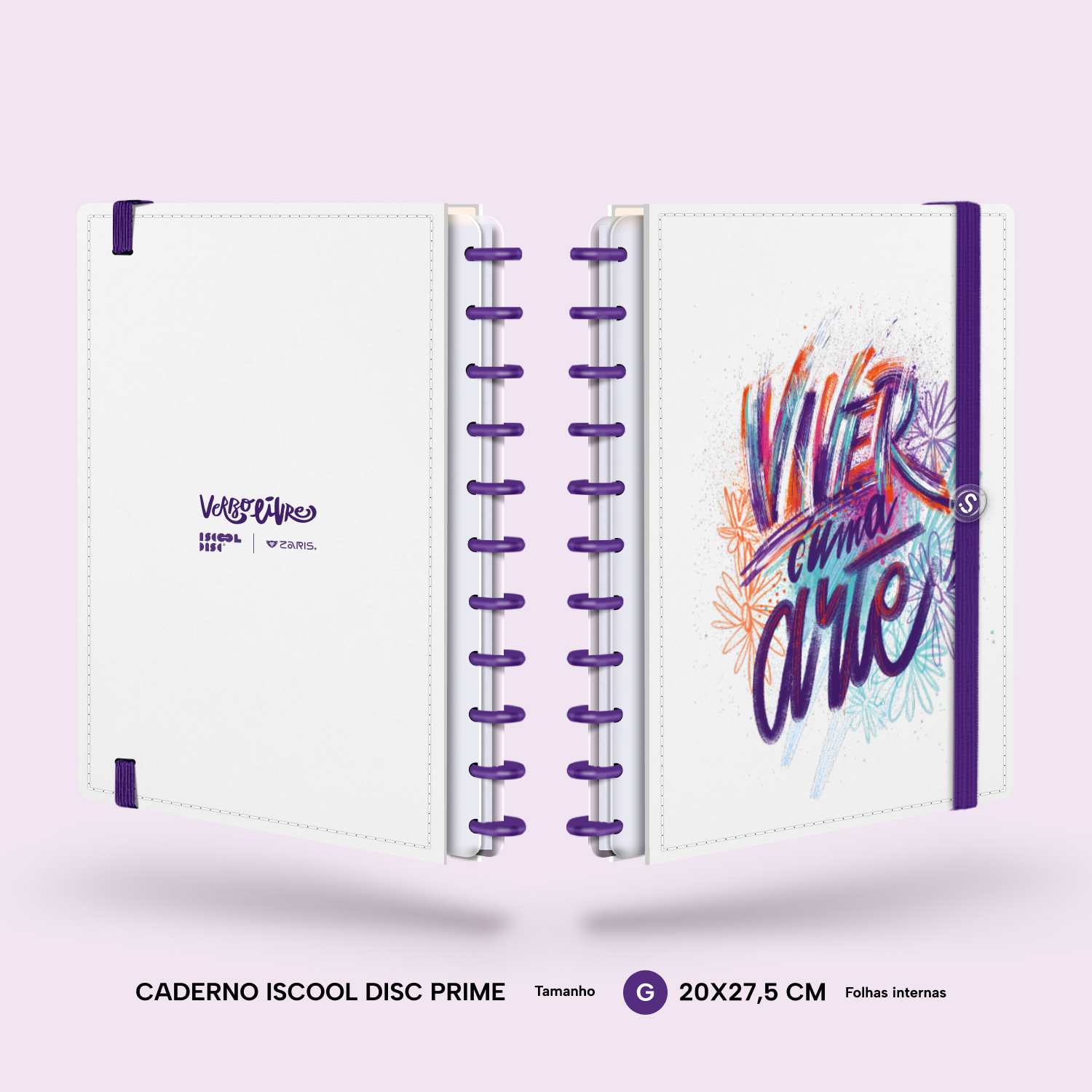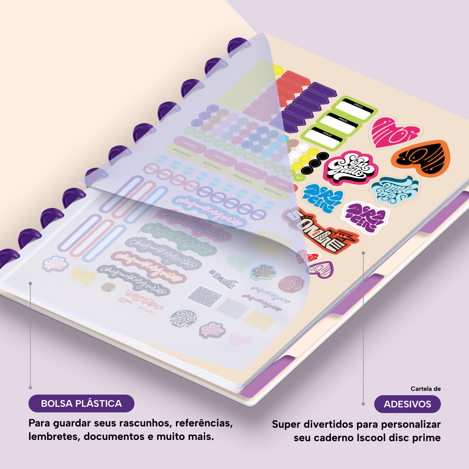 Além de tudo isso, o iscooldisc Prime conta com detalhes que fazem toda a diferença: elástico para fechamento da capa, muito mais estilo e privacidade para suas anotações; bolsa plástica para guardar seus rascunhos, referências, lembretes, documentos e uma cartela de adesivos incríveis, para que você possa personalizar seu caderno do seu jeitinho!