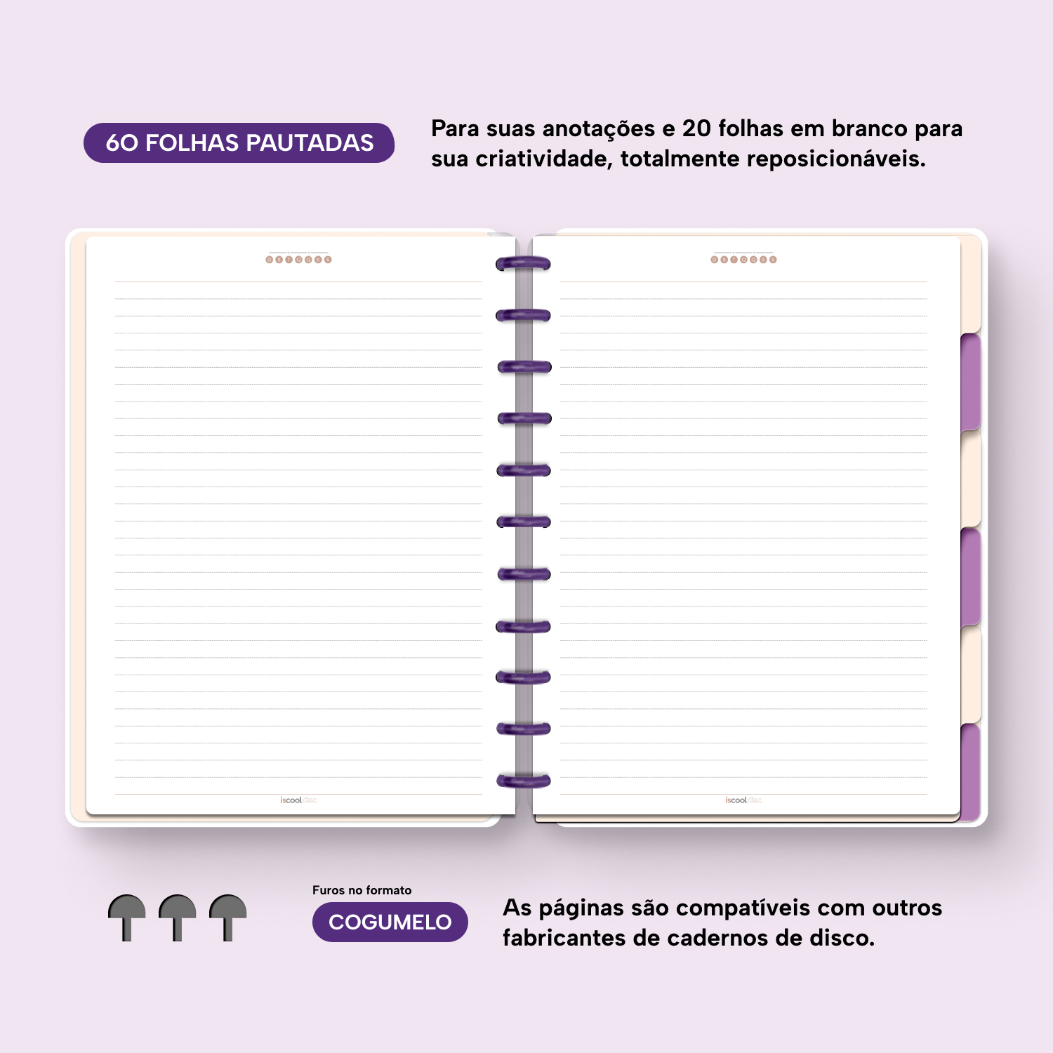 Com furos no formato de “cogumelo”, você poderá dar um “up” em seu caderno com nossos refis, além de ser compatível com outros fabricantes de cadernos de discos.