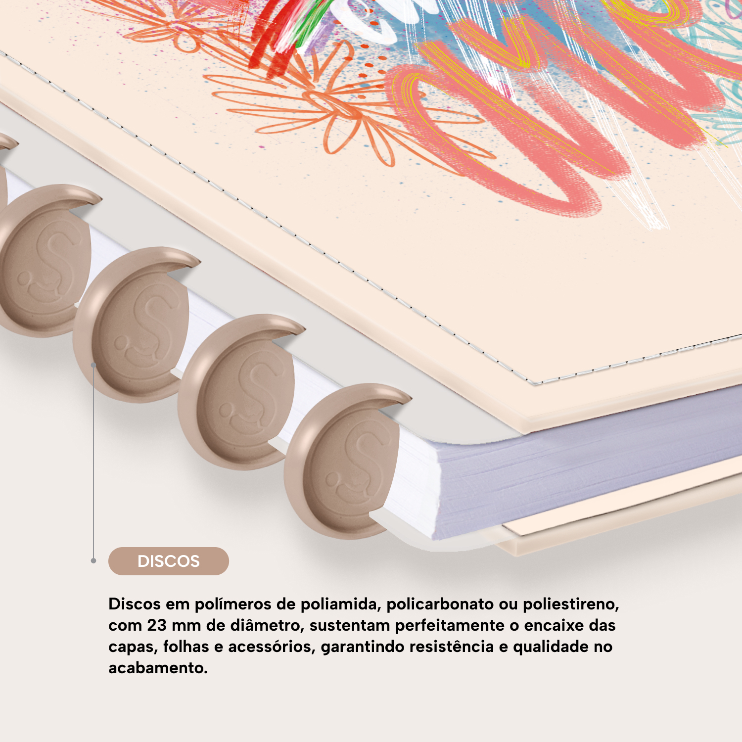 Encadernado com 11 discos M de 23mm em polímero de nylon e/ou policarbonato coloridos, fabricados no Brasil.
