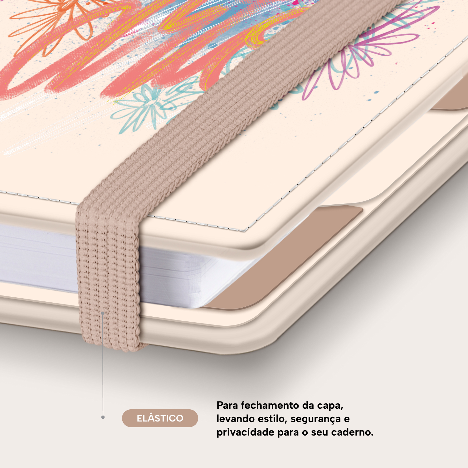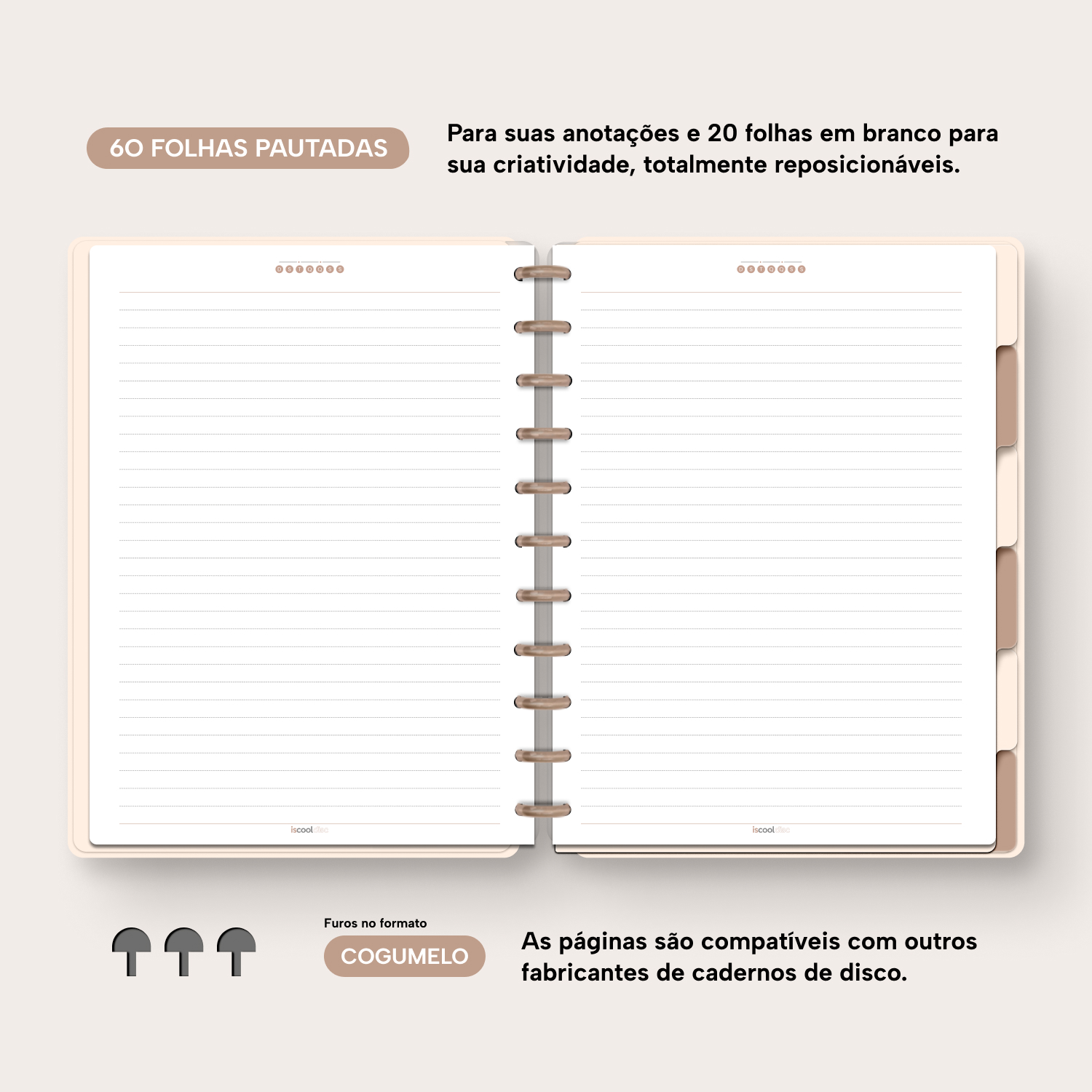 O miolo conta com 60 folhas pautadas decoradas em papel sulfite 90g (aquele papel mais “grossinho”) para que você use e abuse das suas canetas especiais, e 20 folhas em branco, ideais para explorar seu lado mais criativo ou até imprimir nelas.