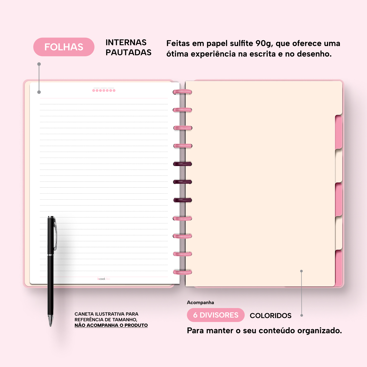 A capa é dura, com impressão digital de alta definição, e acompanha 6 lindas divisórias que você pode colocar em qualquer local do caderno, funcionando como o guia perfeito para sua organização.