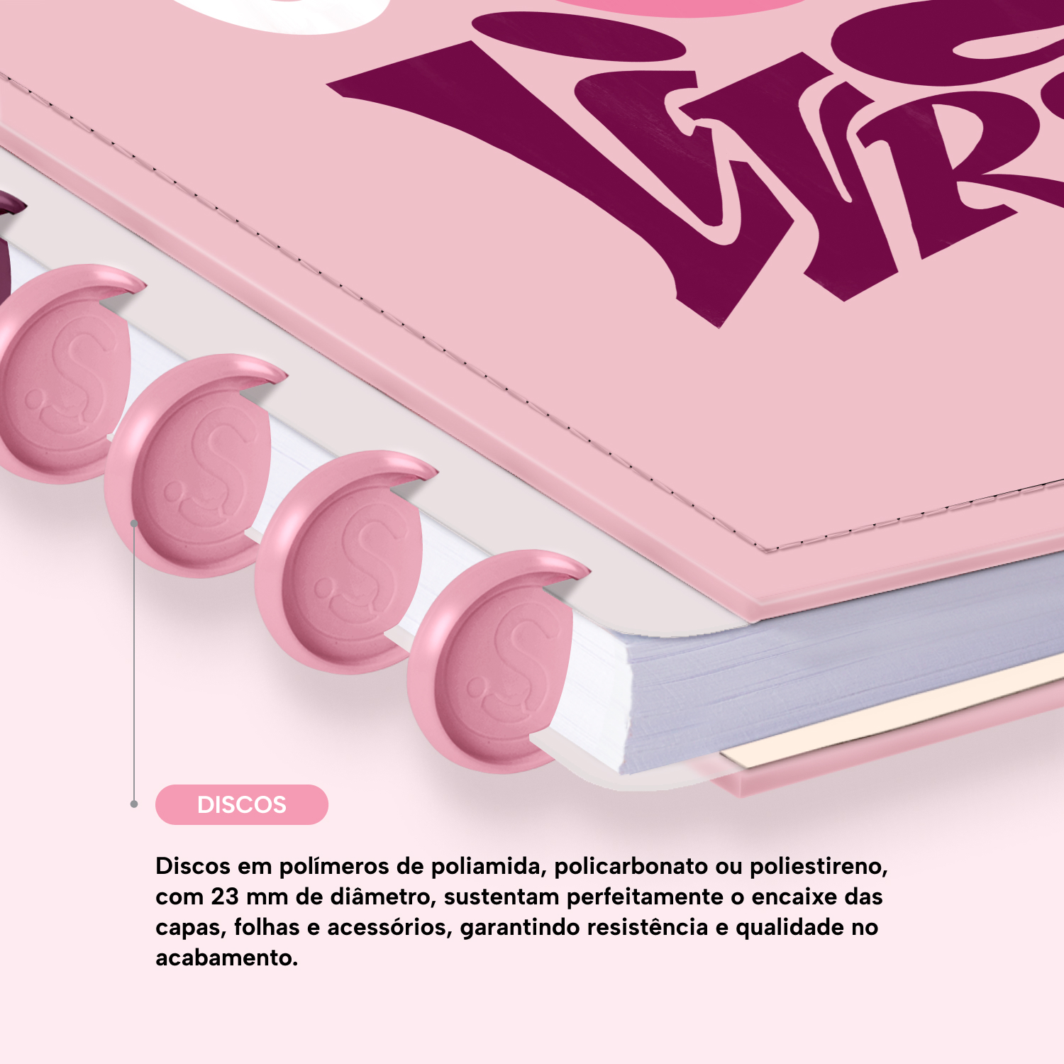 Encadernado com 11 discos M de 23mm em polímero de nylon e/ou policarbonato coloridos, fabricados no Brasil.