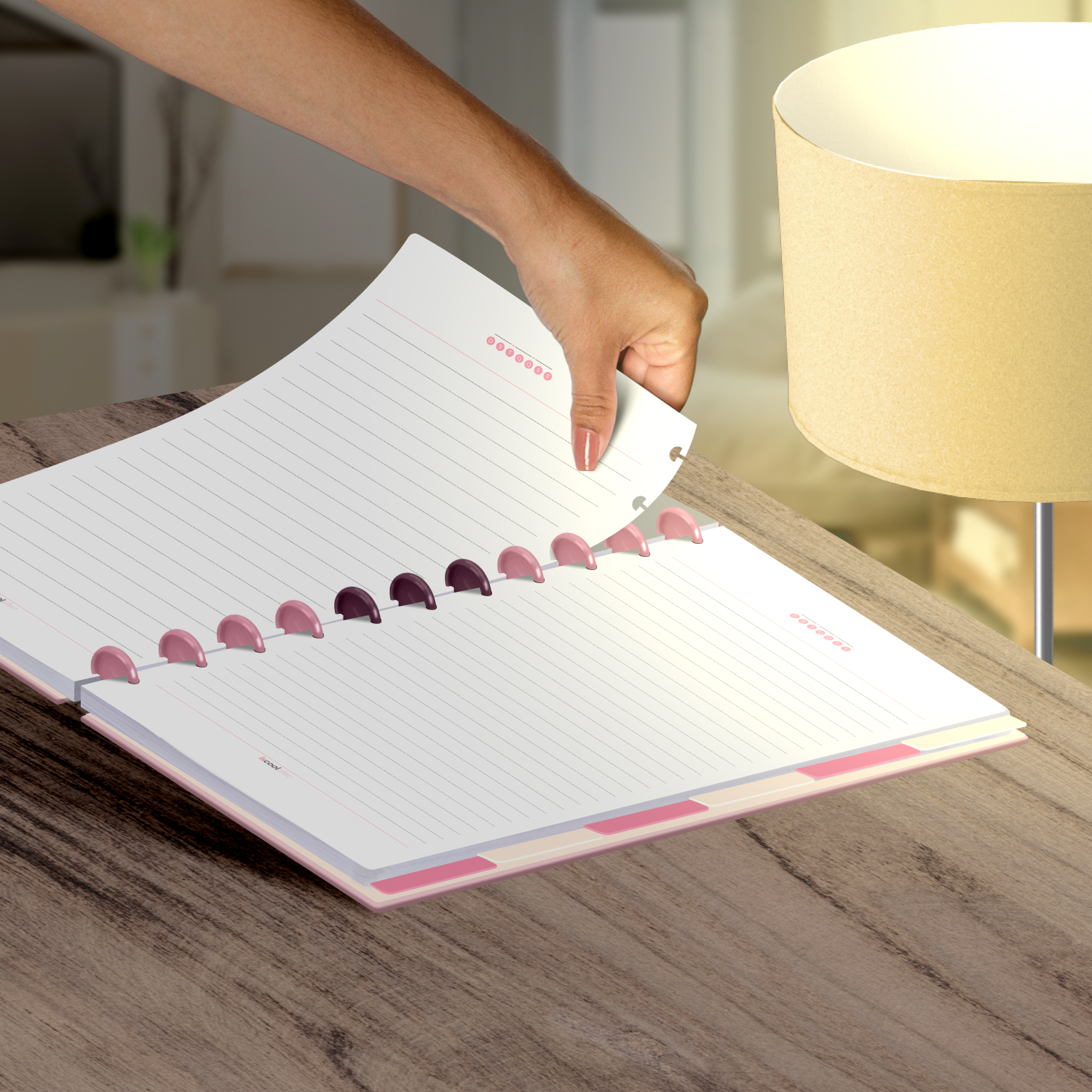 Com furos no formato de “cogumelo”, você poderá dar um “up” em seu caderno com nossos refis, além de ser compatível com outros fabricantes de cadernos de discos.