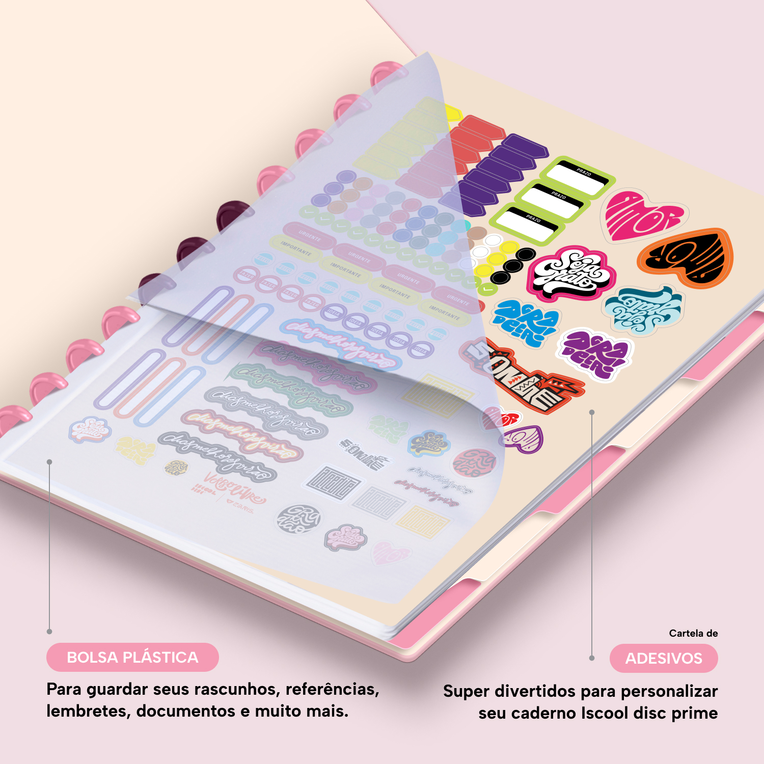 Além de tudo isso, o iscooldisc Prime conta com detalhes que fazem toda a diferença: elástico para fechamento da capa, muito mais estilo e privacidade para suas anotações; bolsa plástica para guardar seus rascunhos, referências, lembretes, documentos e uma cartela de adesivos incríveis, para que você possa personalizar seu caderno do seu jeitinho!