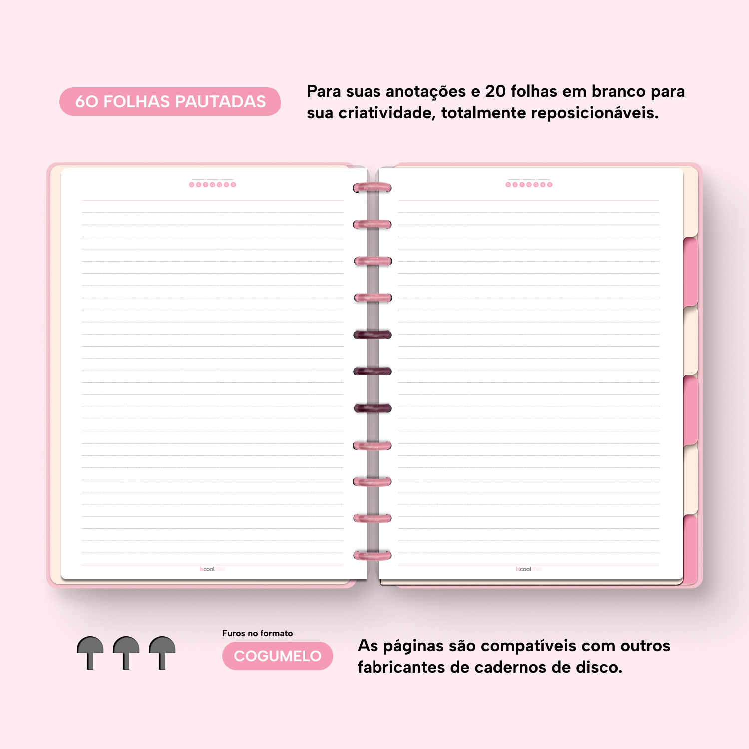 O miolo conta com 60 folhas pautadas decoradas em papel sulfite 90g (aquele papel mais “grossinho”) para que você use e abuse das suas canetas especiais, e 20 folhas em branco, ideais para explorar seu lado mais criativo ou até imprimir nelas.