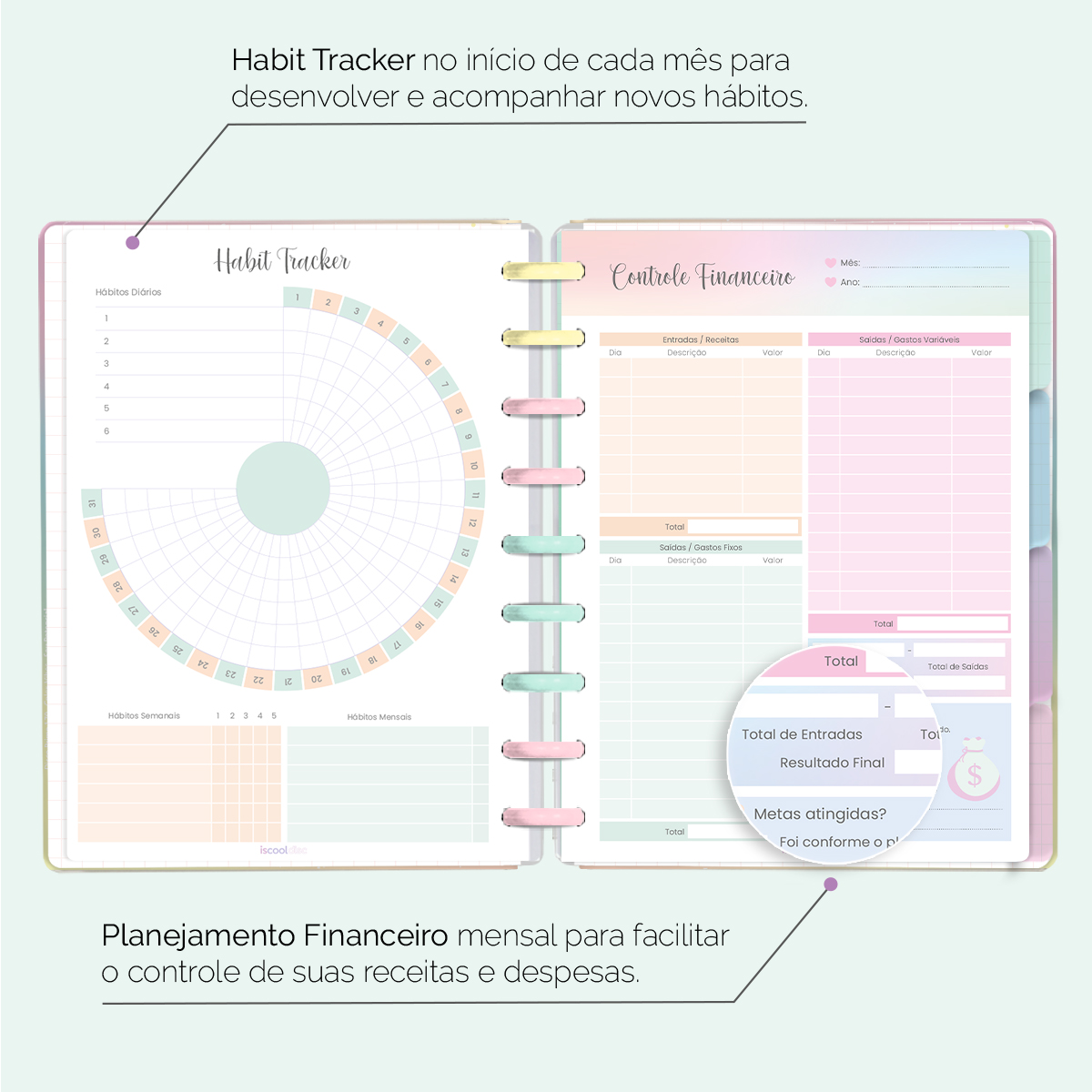 No início de cada mês, há um planejamento mensal, facilitando visualmente as suas principais anotações, um "Habit Tracker" para você desenvolver novos hábitos ou controlar os mais importantes, e ainda um planejamento financeiro, facilitando o controle das suas receitas e despesas, além de inúmeras outras funcionalidades.