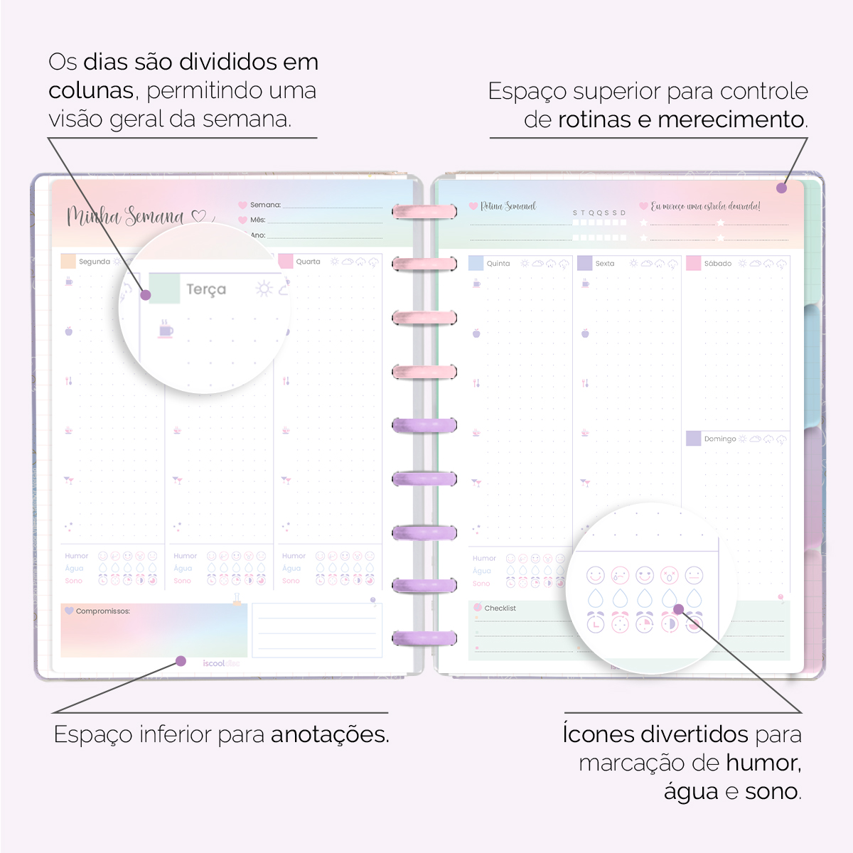 Os dias são divididos em colunas, permitindo uma visão geral da semana, onde você mesmo irá indicar o dia, a semana, o mês e o ano. Assim, você pode utilizar o seu planner independentemente do ano em que estivermos. Não é incrível?