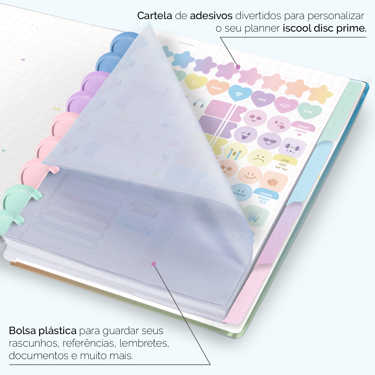 Além de tudo isso, o ISCOOL DISC Planner Permanente conta com detalhes que fazem toda a diferença: elástico para fechamento da capa, proporcionando muito mais estilo e privacidade para suas anotações; bolsa plástica para guardar seus rascunhos, referências, lembretes e documentos; e uma cartela de adesivos incríveis para que você possa personalizar o planner do seu jeitinho!