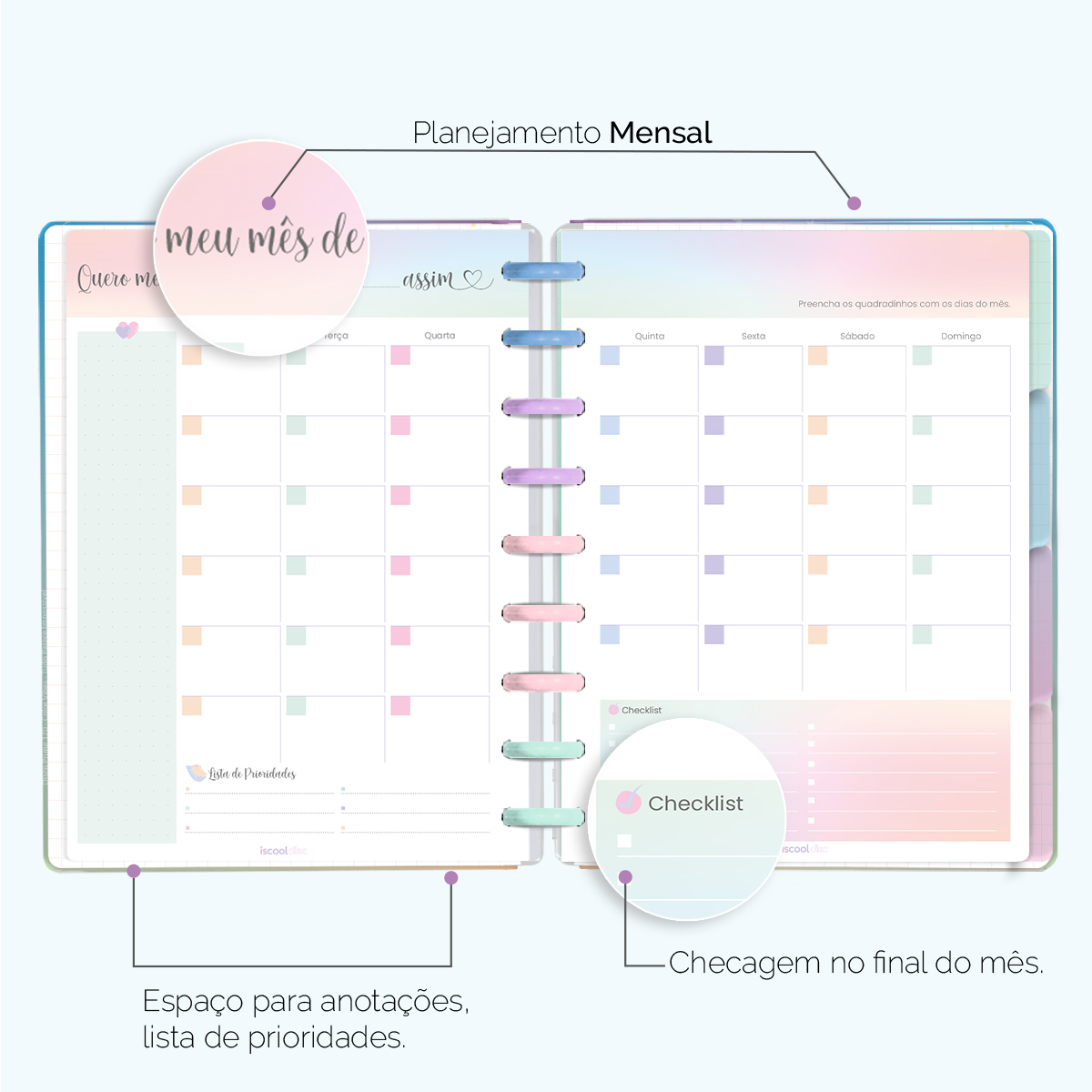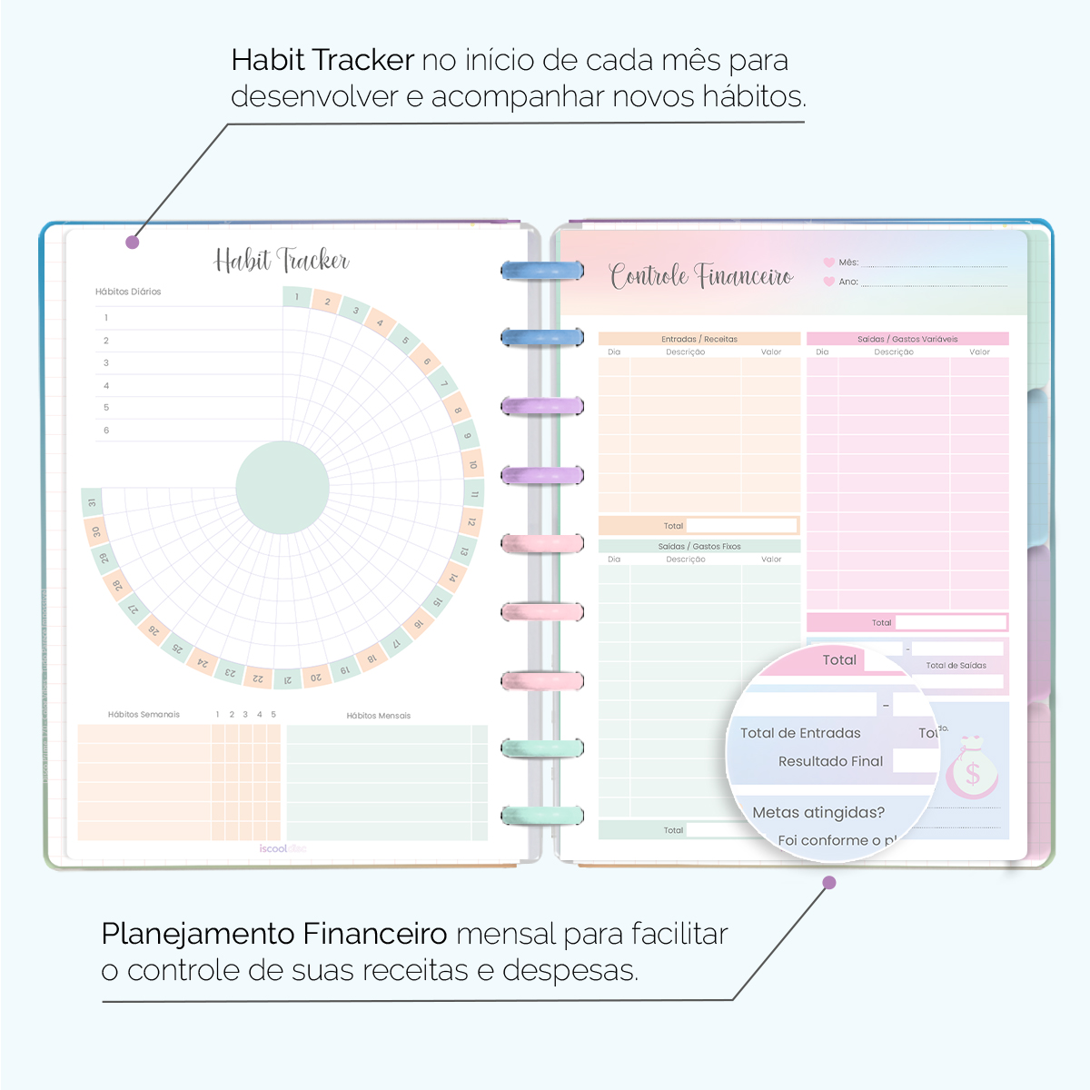 No início de cada mês, há um planejamento mensal, facilitando visualmente as suas principais anotações, um "Habit Tracker" para você desenvolver novos hábitos ou controlar os mais importantes, e ainda um planejamento financeiro, facilitando o controle das suas receitas e despesas, além de inúmeras outras funcionalidades.