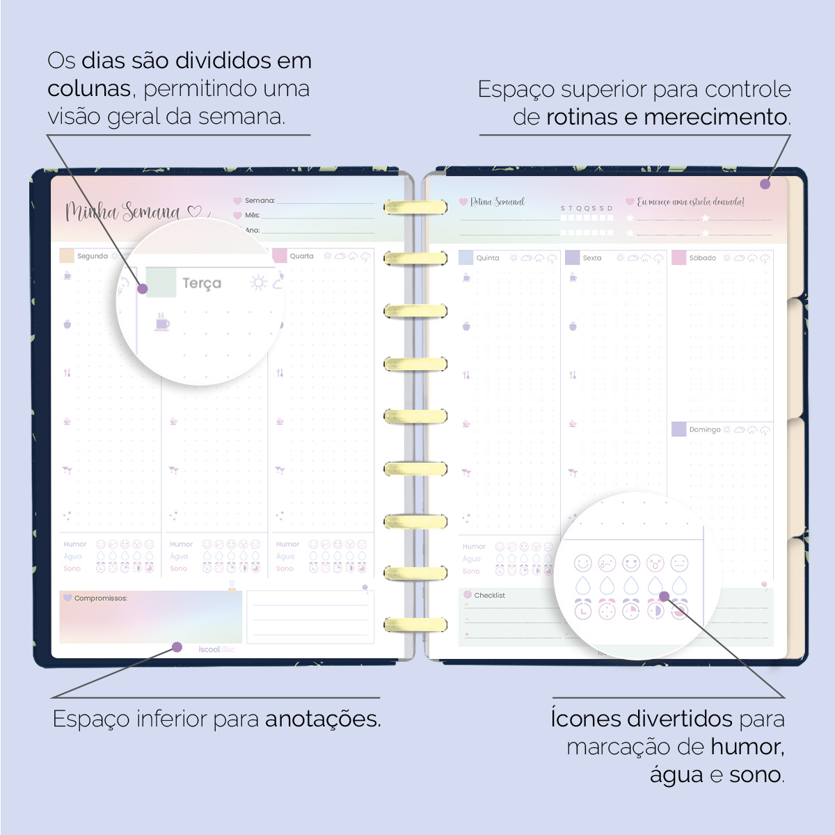 Os dias são divididos em colunas, permitindo uma visão geral da semana, onde você mesmo irá indicar o dia, a semana, o mês e o ano. Assim, você pode utilizar o seu planner independentemente do ano em que estivermos. Não é incrível?