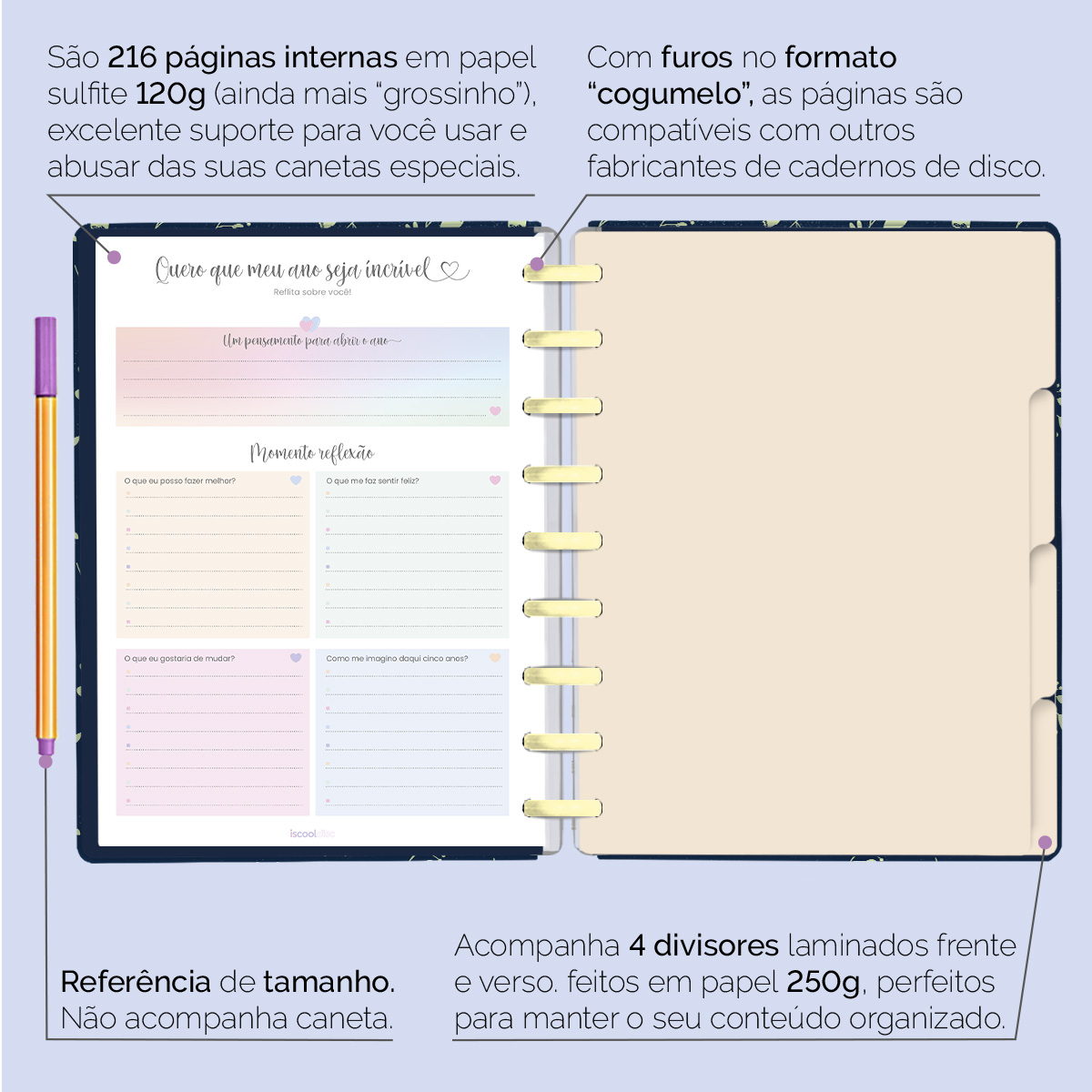 O miolo conta com páginas decoradas em papel sulfite 120g (aquele papel ainda mais "grossinho"), para que você use e abuse das suas canetas especiais. Com furos no formato de "cogumelo", você poderá dar um "up" nele com nossos refis, além de ser compatível com outros fabricantes de cadernos e planners de discos.